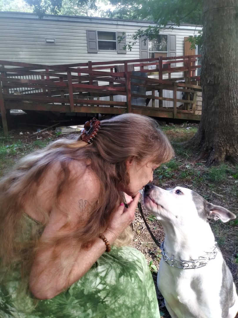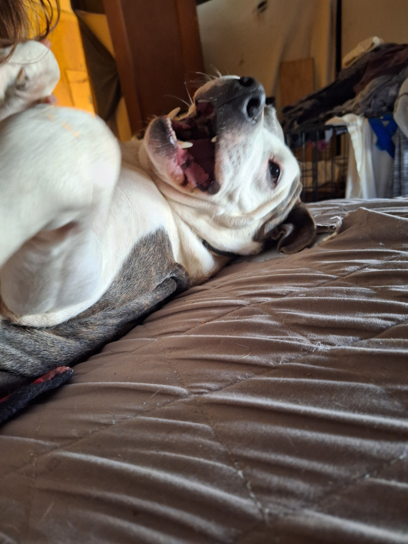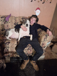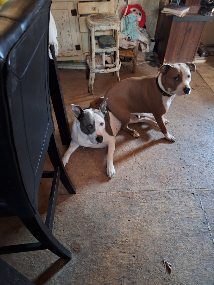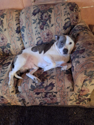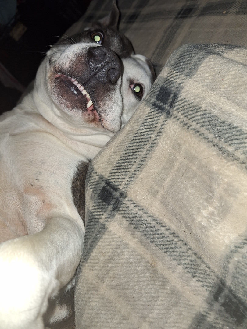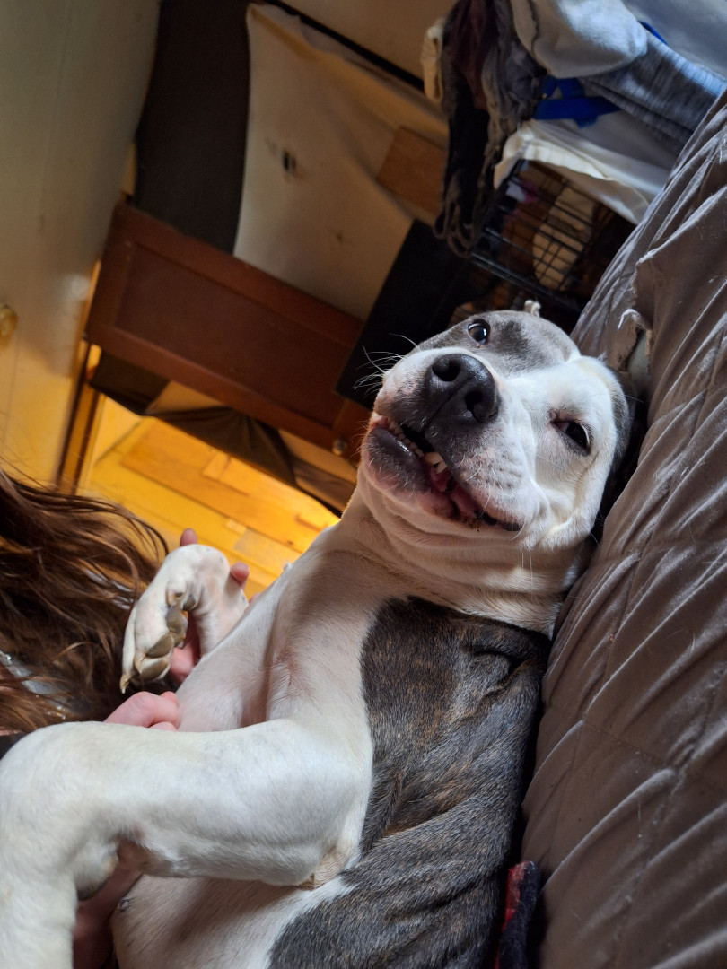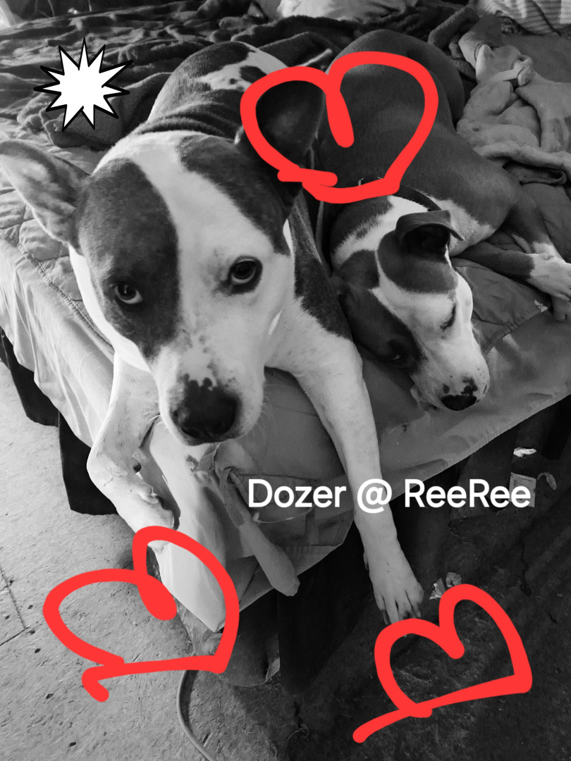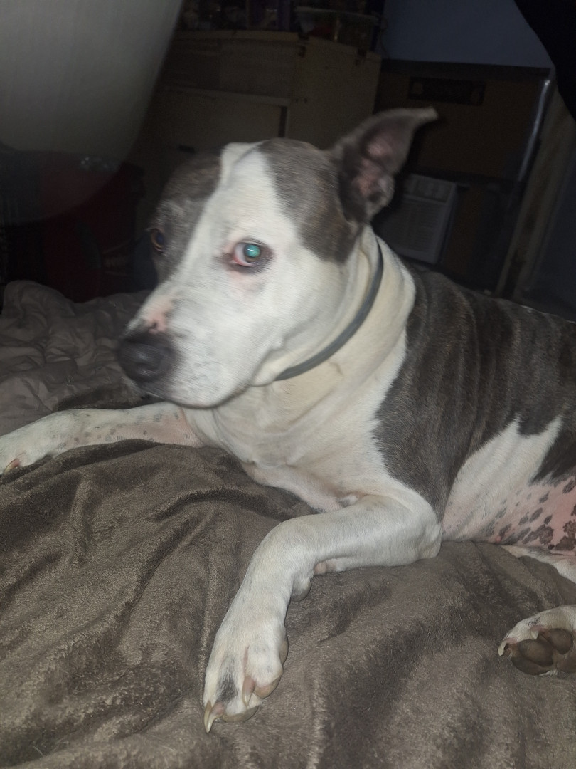 Dozer is a blue nose pitbull. Sweet kind & loving....I have bad PTSD & he is constantly on the alert, waking me if I cry out, love unlimite