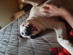 Dozer is a blue nose reverse brindle pit bull, at 100 lbs he is my protector & best friend. Pits have been given such a horrible reputation, he is the poster dog to let ppl know he is gentle,intelligent, loving, playful, he can be protective but I live alone so that's good. I control him with verbal commands & he knows all basic in german,english,& a combo of vocal cues & hand signals. He loves everyone he meets, his worst habit being he will try to steal candy or gum from old ladies purses!