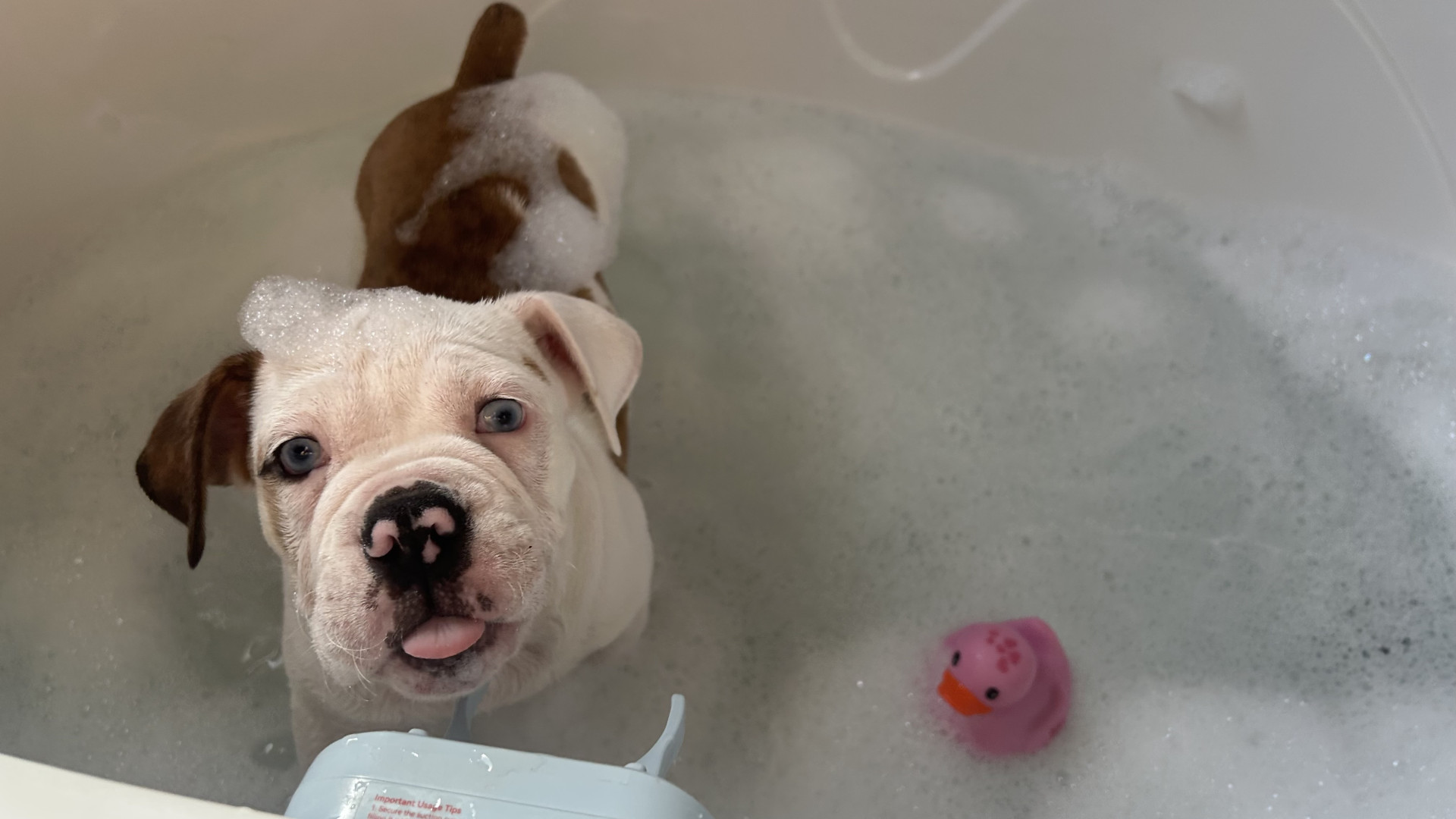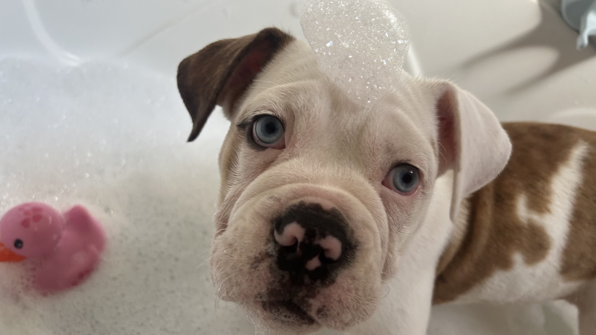 Both her big blue eyes and the fact that she loves to swim under water like a mermaid and scare me . She’s a Beabull so a unique blend of an English Bulldog and a Beagle. She’s a little too smart for her own good sometimes.