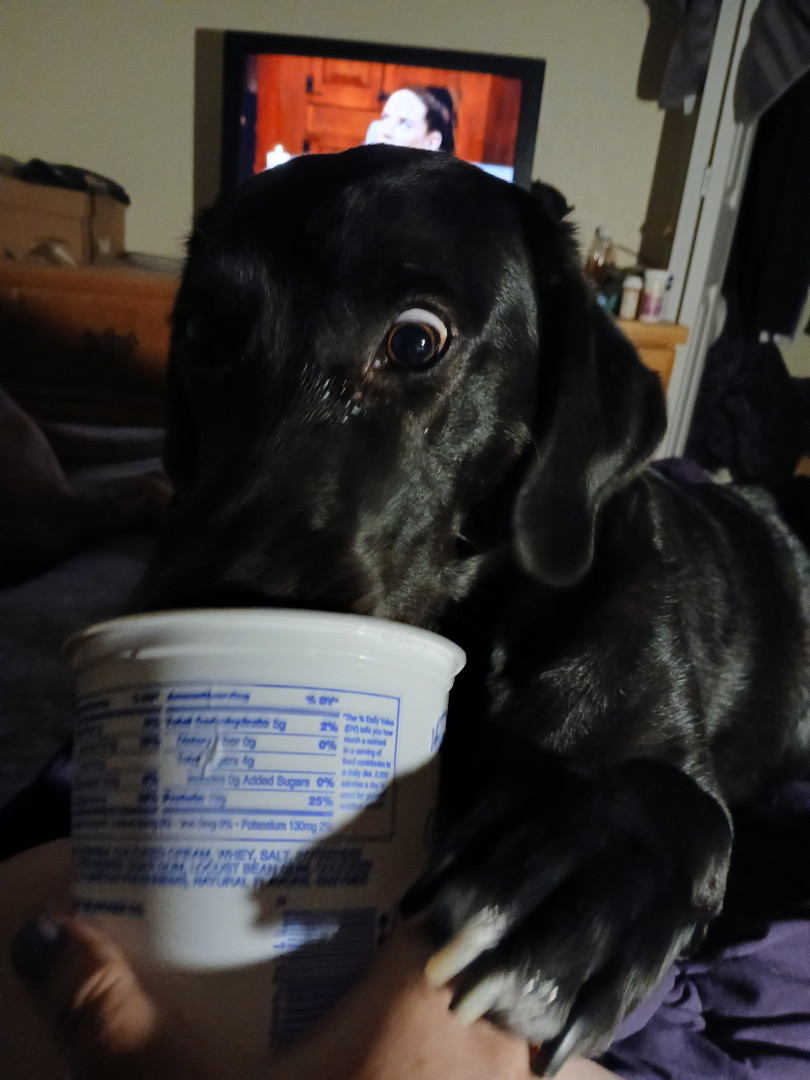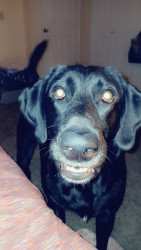 He always has big goofy eyes when trying a treat or food, or when you surprise him. You can see the whites of his eyes when he trying food. It's so funny.