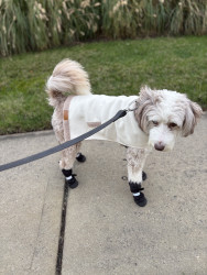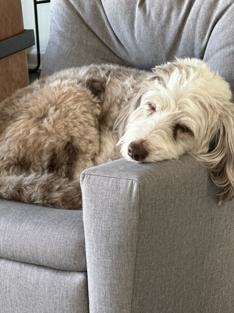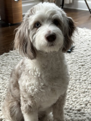 Ellie has one blue eye and one brown eye like her mother. She is a miniature Aussie doodle with white, cream and brown markings to make her look like a super model and round it out with the softest coziest coat. Everyone thinks she is a puppy but she will be 7 next month.
