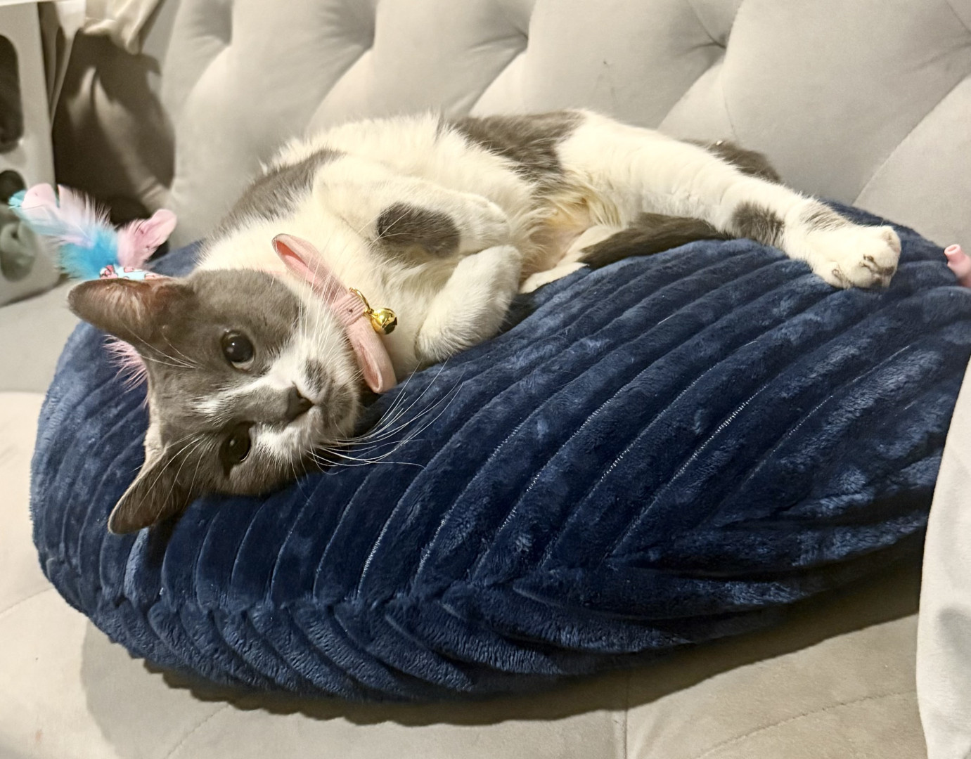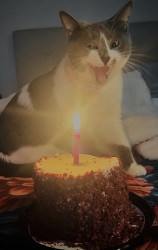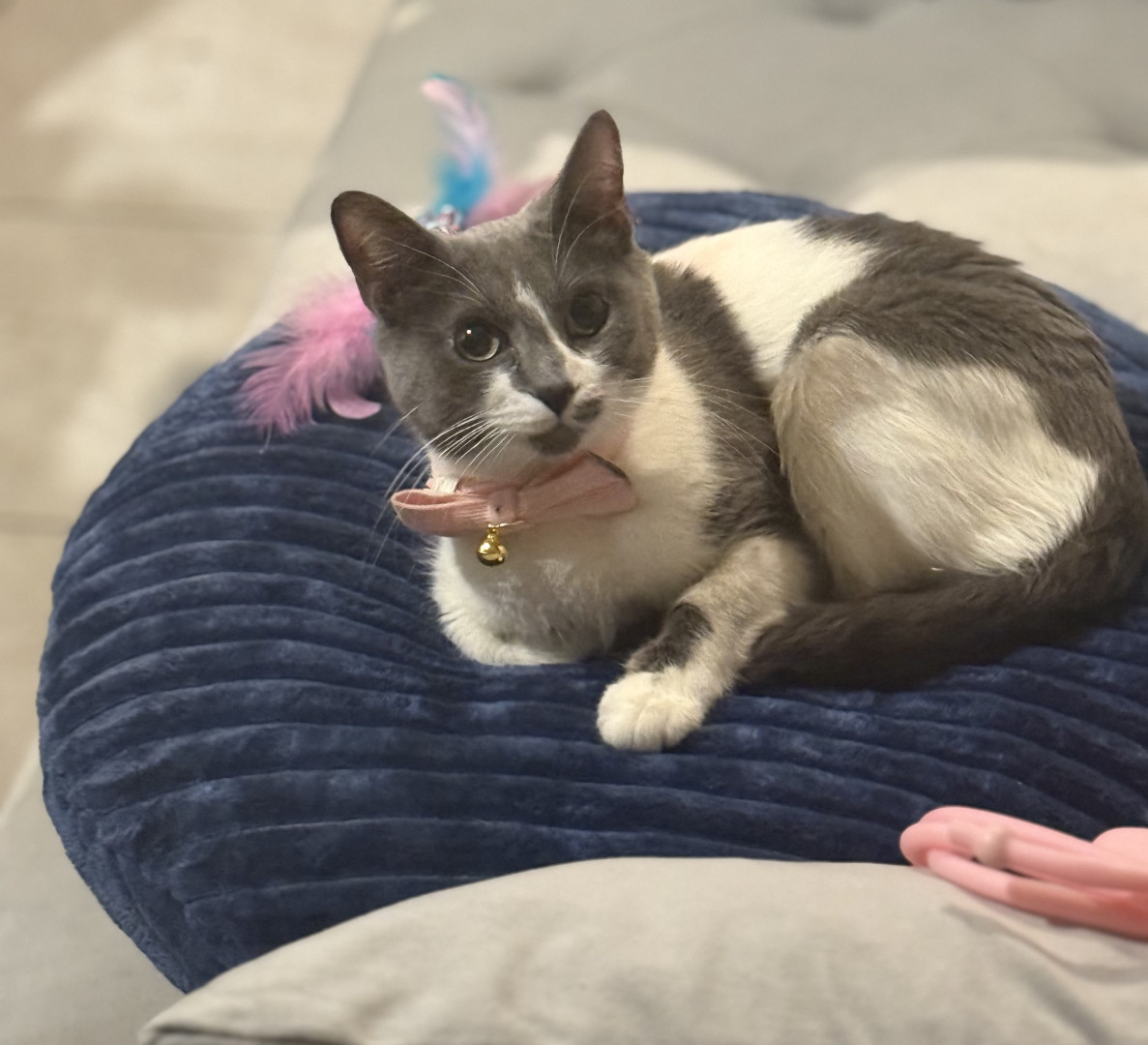 Her go-to treat is a Temptations snack! Her favorite toy is anything she can chase or bat around, especially feather wands that let her show off her playful side. It instantly gets her attention and reminds her she’s the cutest cat in the room!