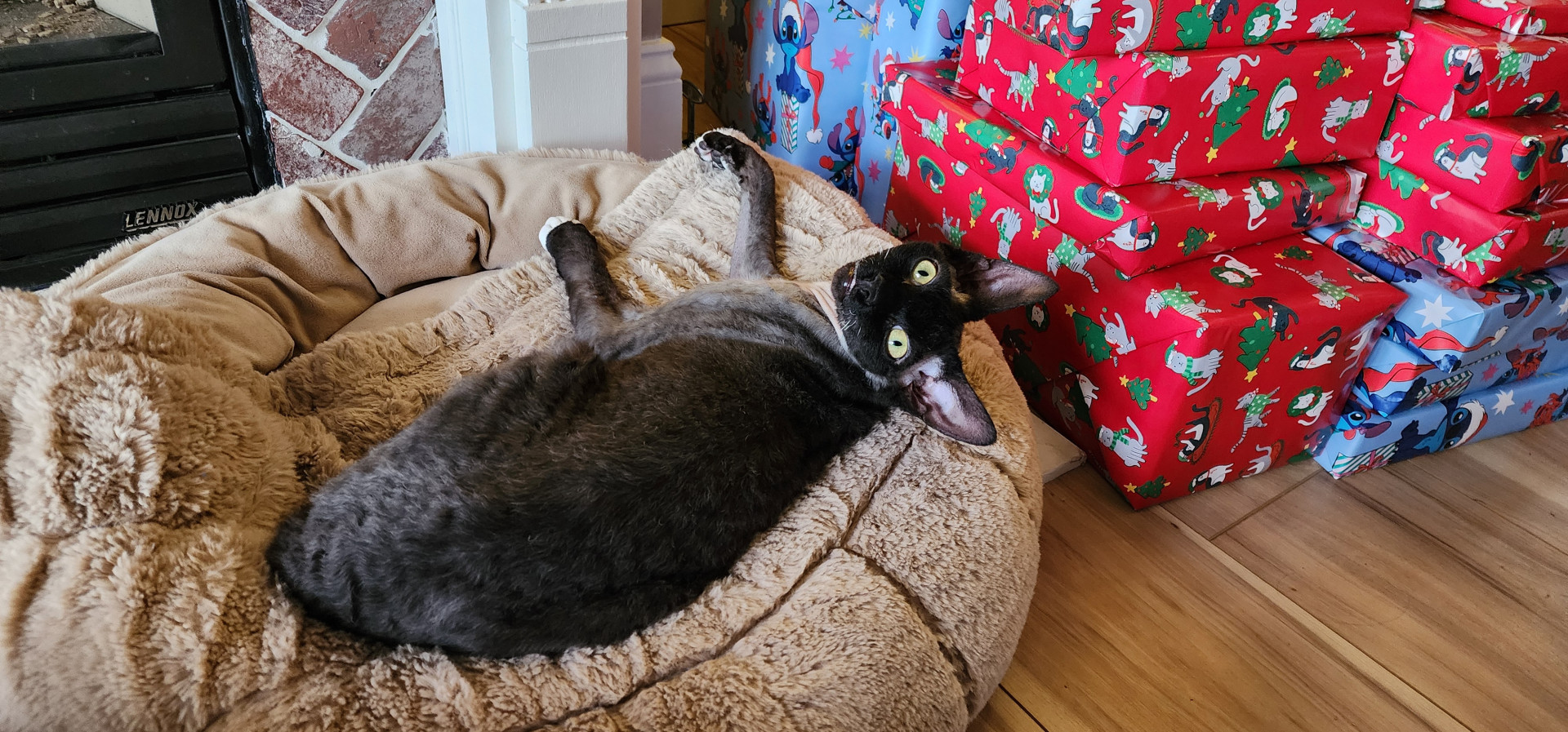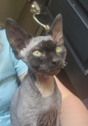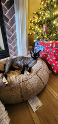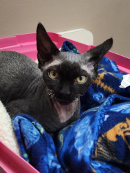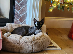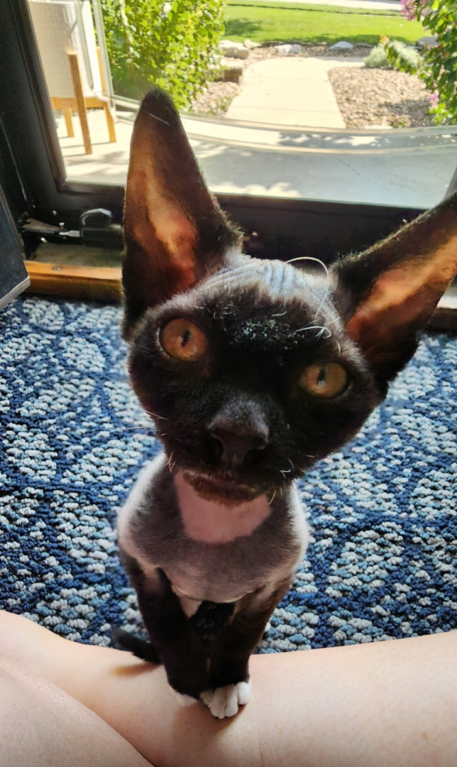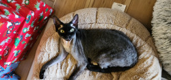 Elvira is a rescue so we're not quite sure of her breed. She resembles a Cornish Rex mix with her super soft, wavy fur. She also appears to be wearing a bald cap, although her winter fur has come in a little more now that it's chilly outside so there's less sun coming in through the windows.