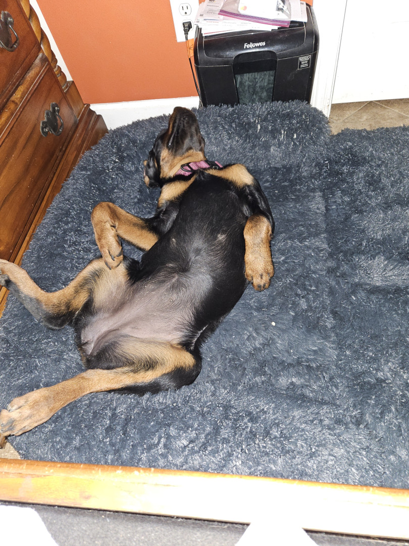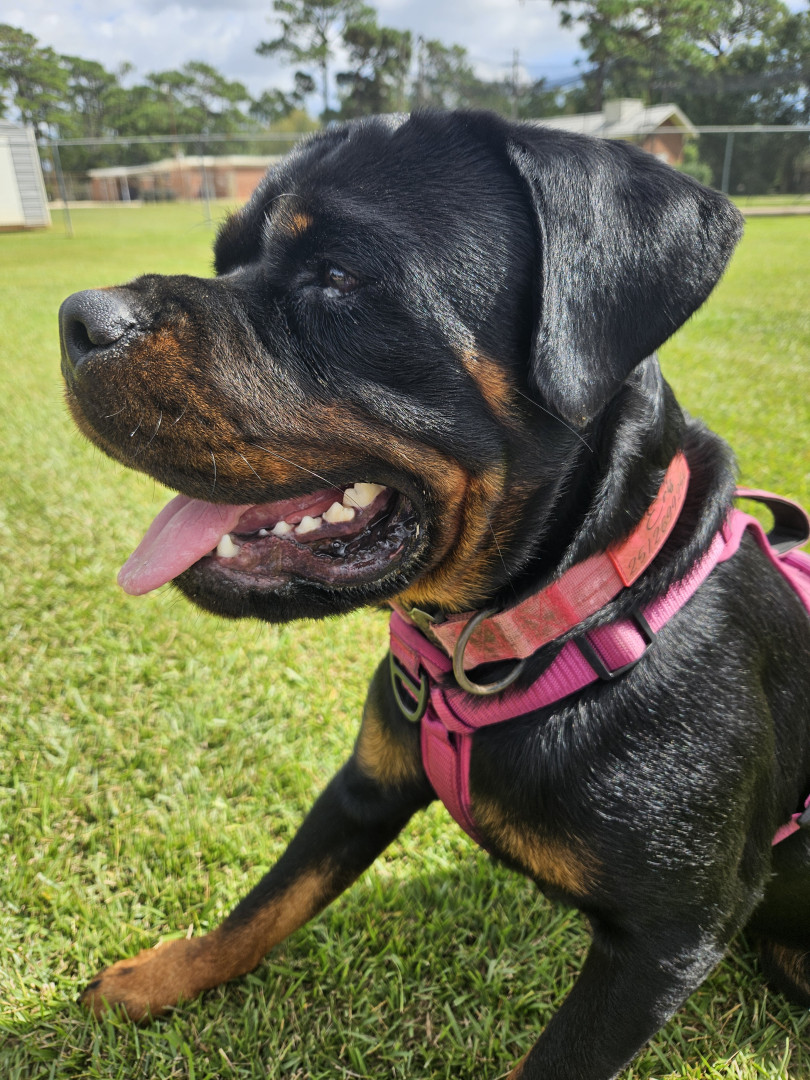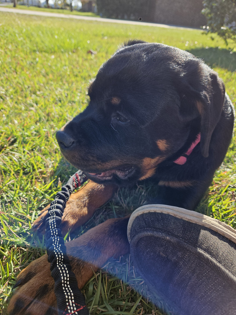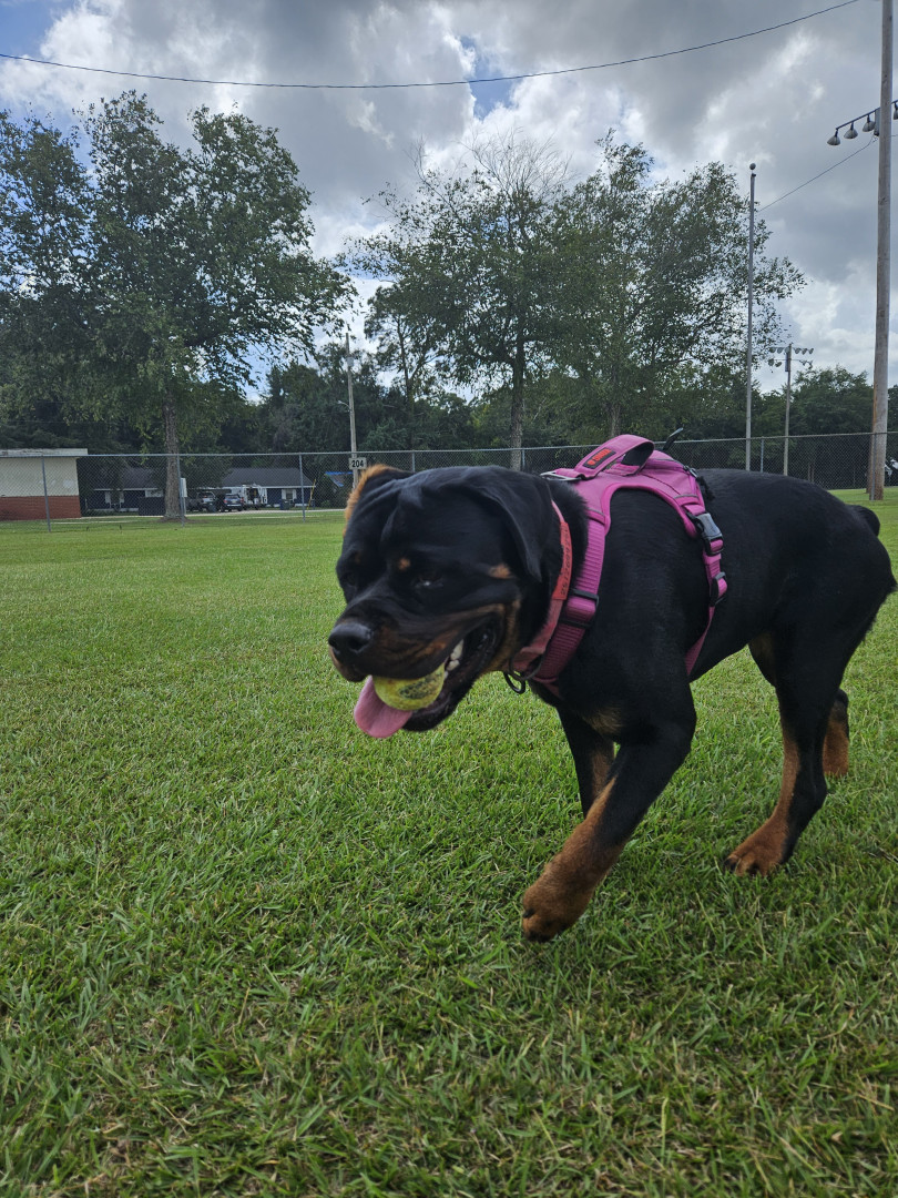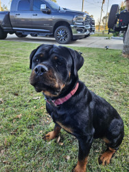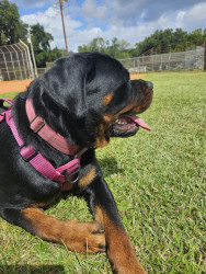 German rottweiler 15 months old and is a sweetheart. She loves playing with her toys especially her ball. She came to us at 3 months old