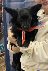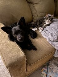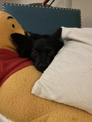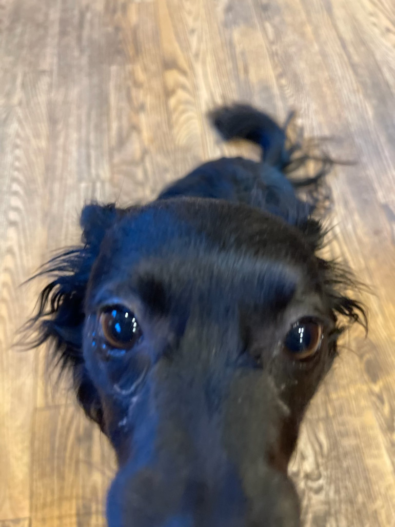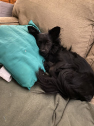 Evie is an almost 3 doxie mix. She follows my mom around like a second shadow, loves to run in snow, hates rain, and loves to cuddle.