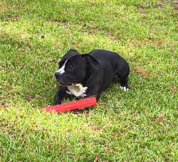 His favorite toy is his stuffed hot dog and his favorite treat is Pepperoni and Salami.