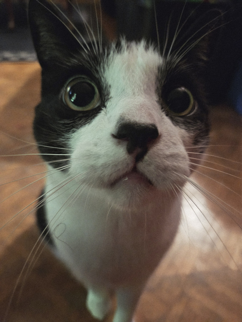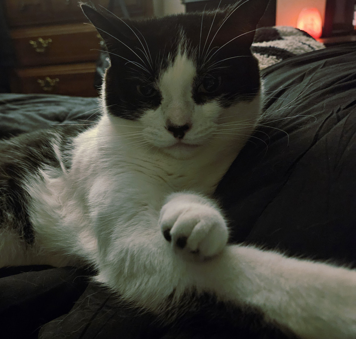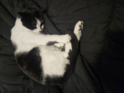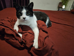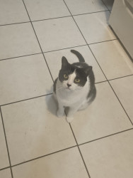 Felix is a very smart playful tuxedo cat. He loves playing with his toys and he will do flips. He's very bright.