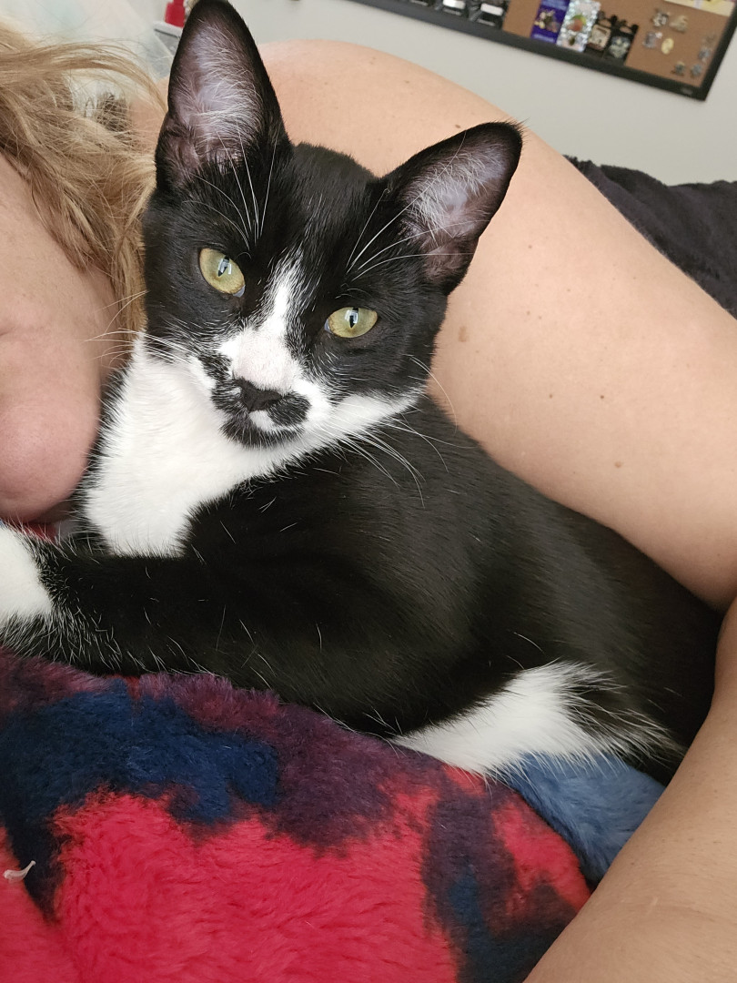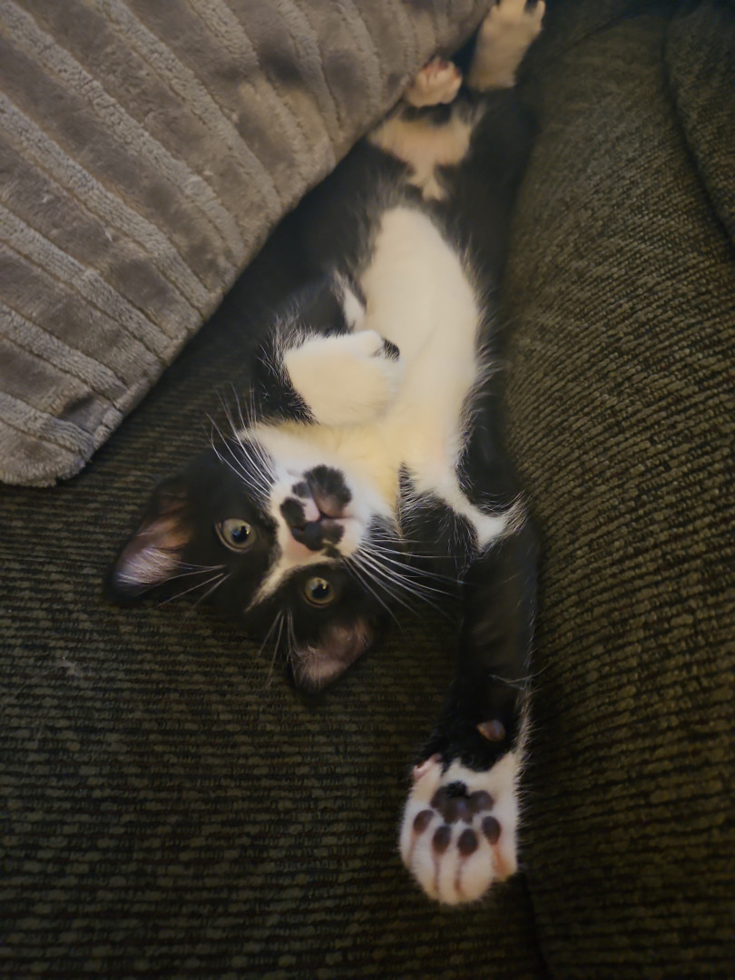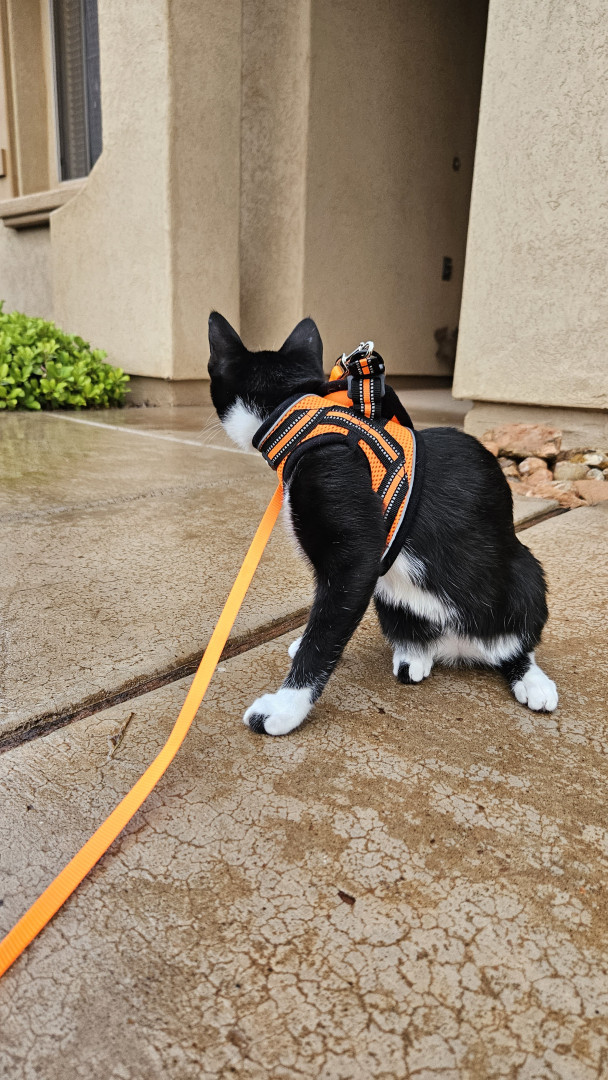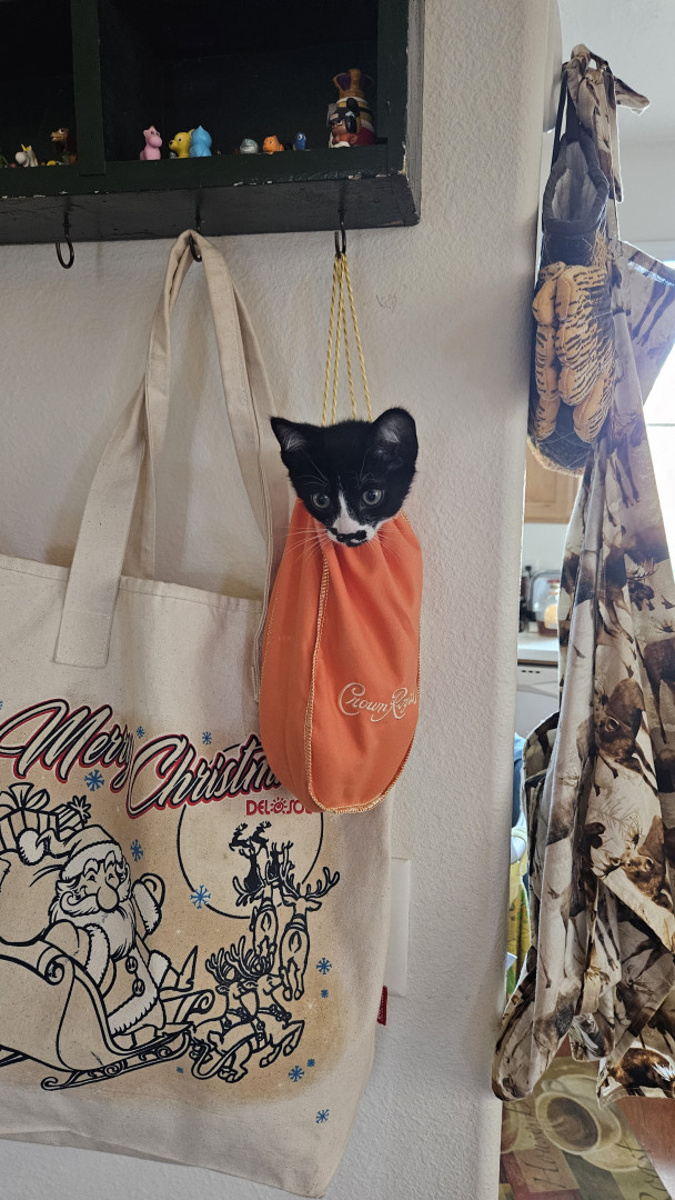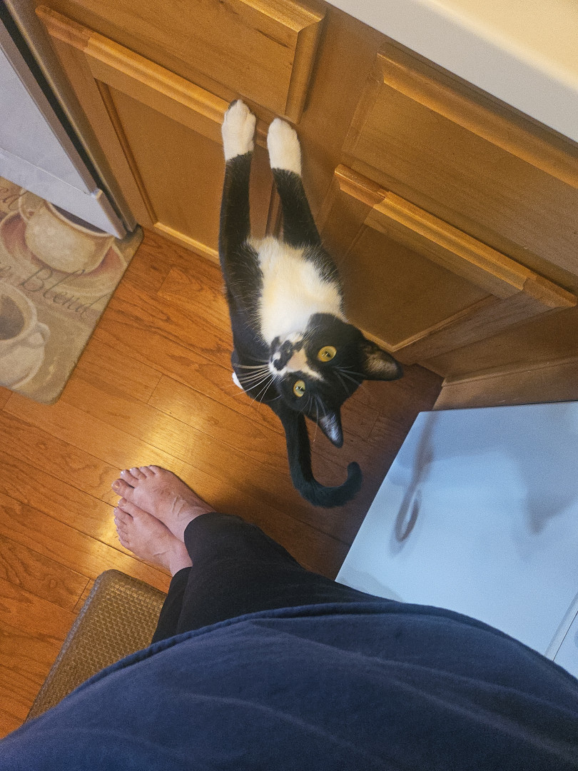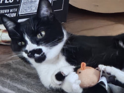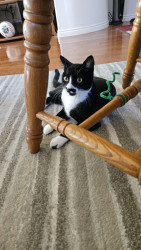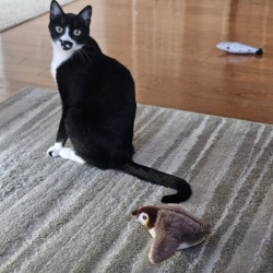 He likes thr freeze dried minnows and will do anything for chicken Temptations. His favorite toy is a good ol' fashioned twisty tie.
