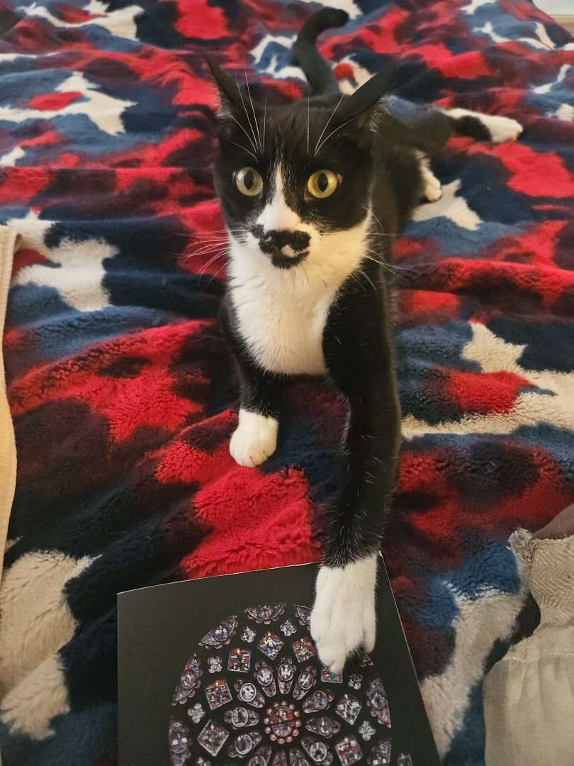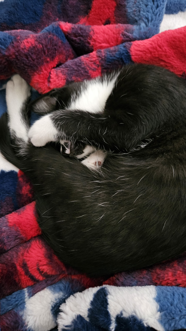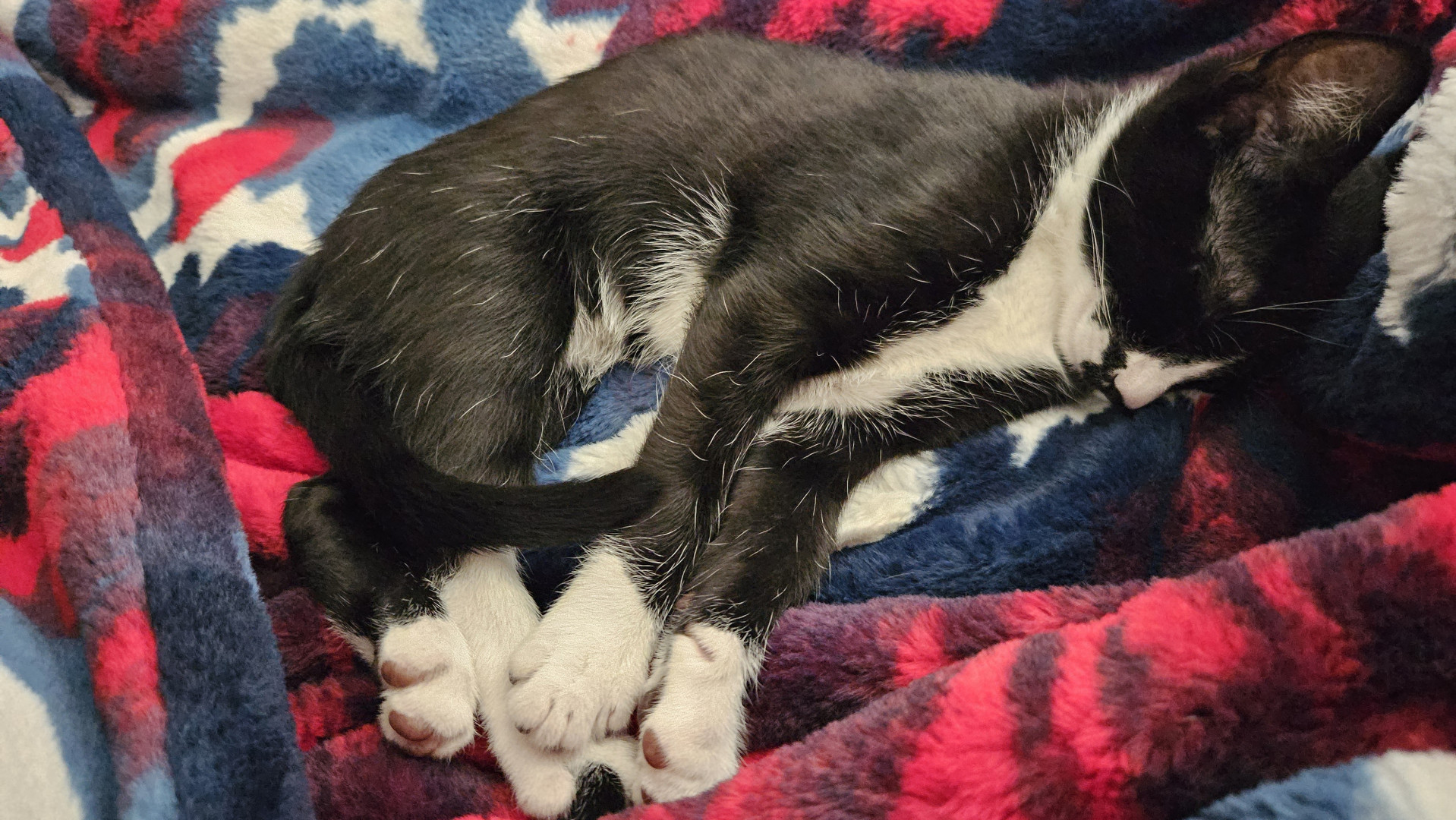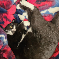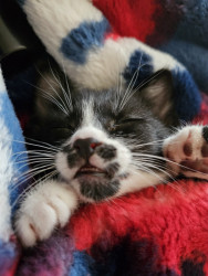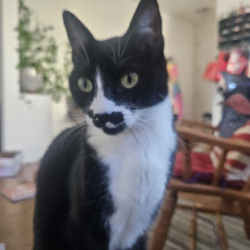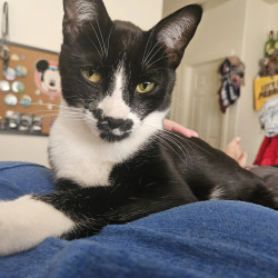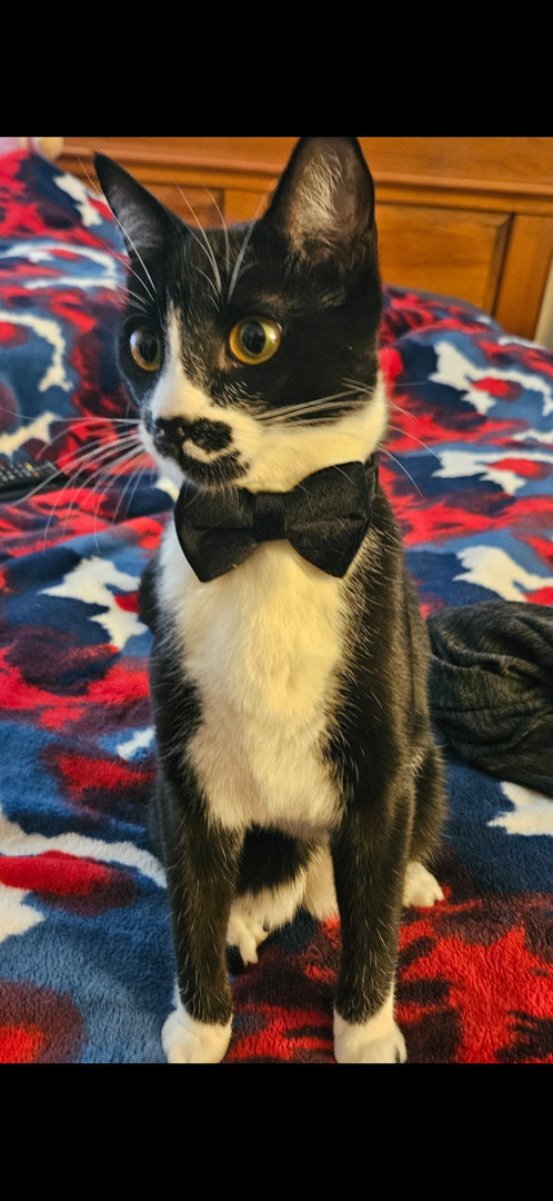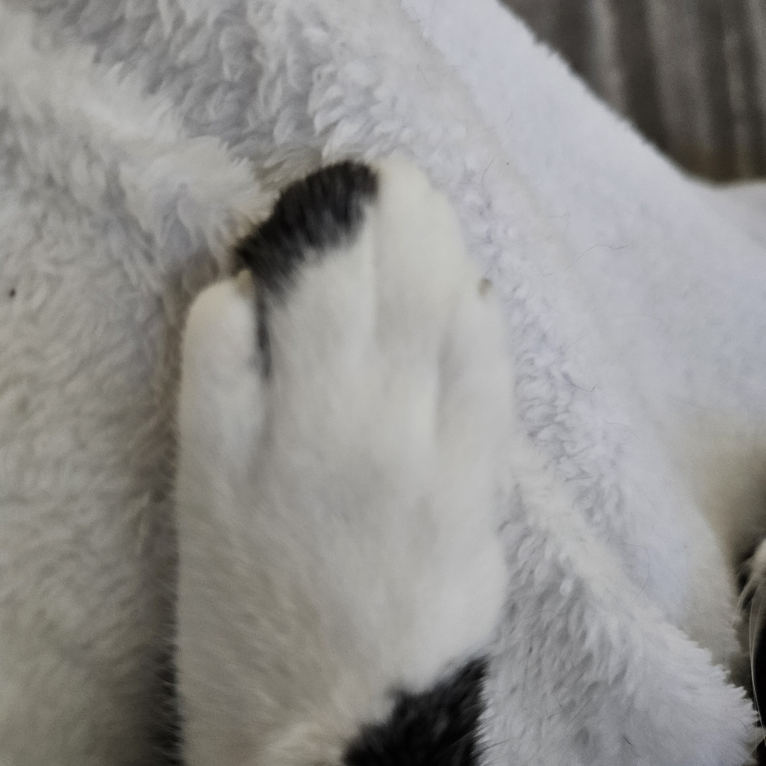 His left front paw and right back paw have one toe that is black while the rest are white. He also has very unique facial markings.