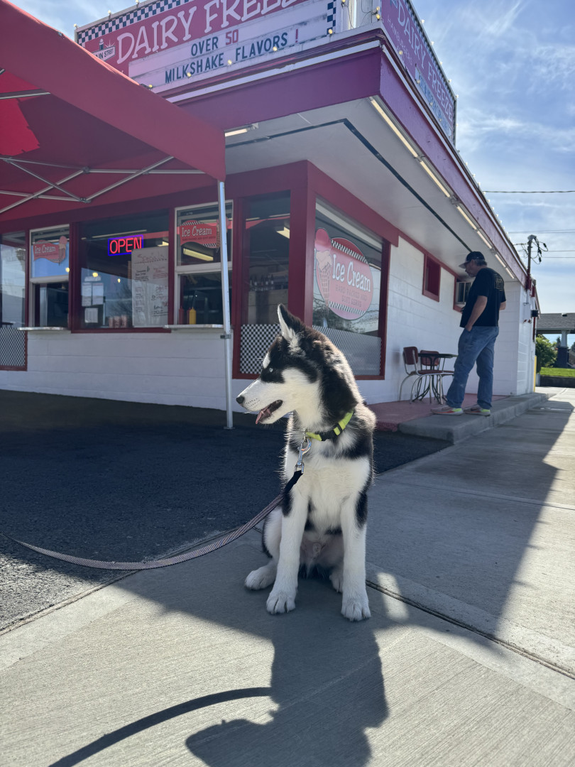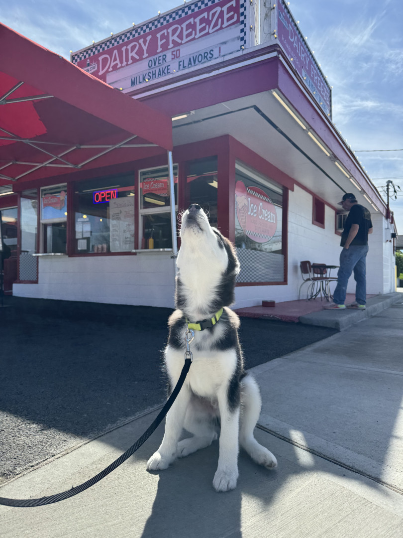 Because he is so silly, happy, and loves his family especially the baby girl. He is our town’s favorite restaurant, Dairy Freeze, mascot! He loves going on walks and greeting other people as well as their dogs. He is always looking to have fun and make others happy!