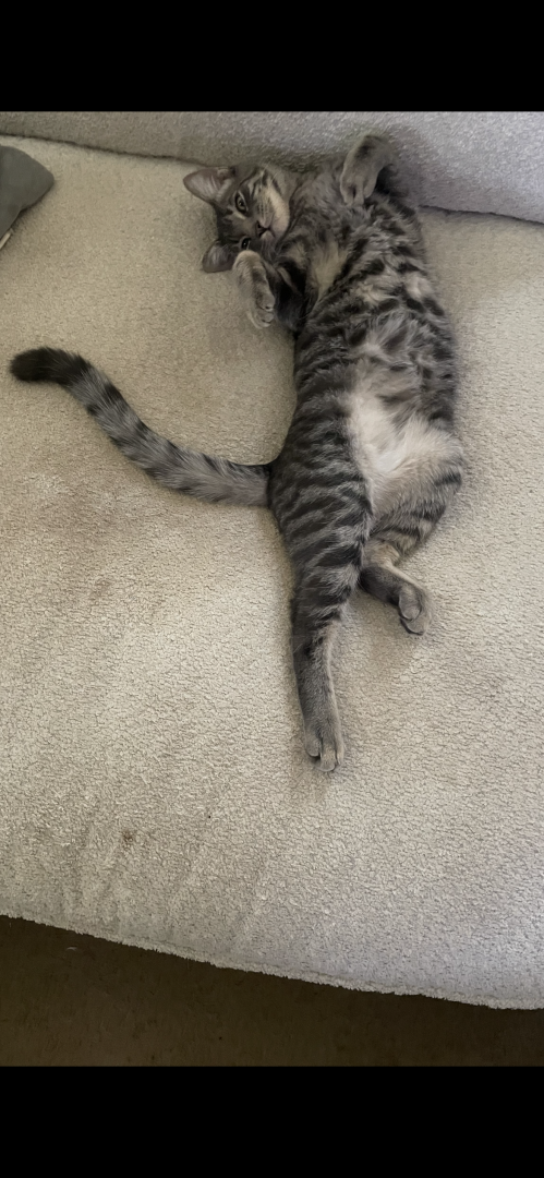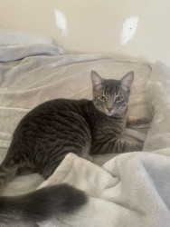 Finn has unique markings and a very long tail for a cat. He loves to talk a lot.