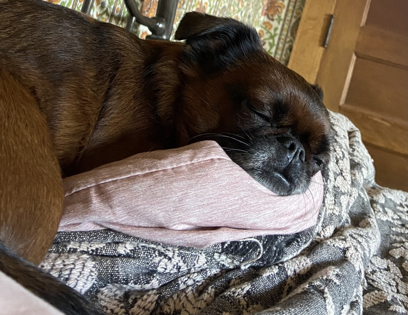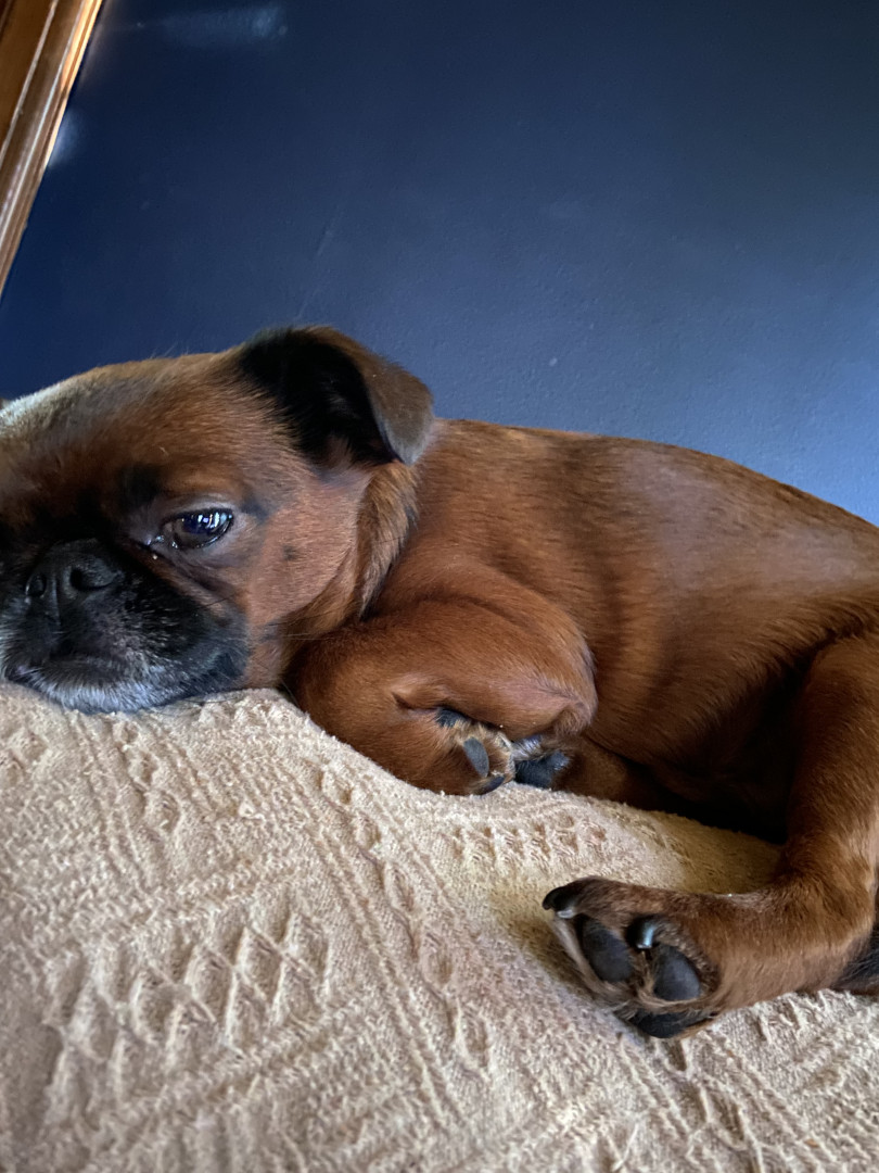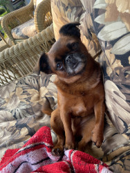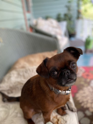 Finn is a smooth coated Brussels griffon. He’s approximately 4 years old. He loves walks, snacks, naps, cuddles, and more snacks.