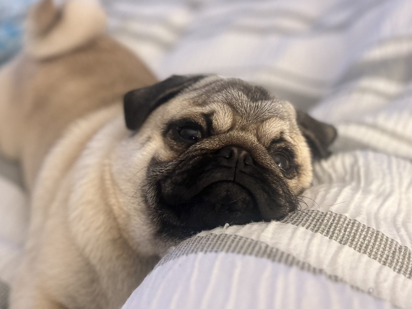 His favourite is his goose. He plays with and then brings it to bed with him. He is spoiled and get baked chicken an and salmon for treats.