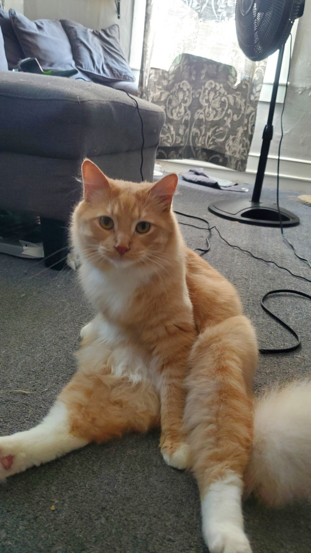 Fish just like his name flops on the ground purring when his people are home. He's a love bug who enjoys odd places, hanging out and cha