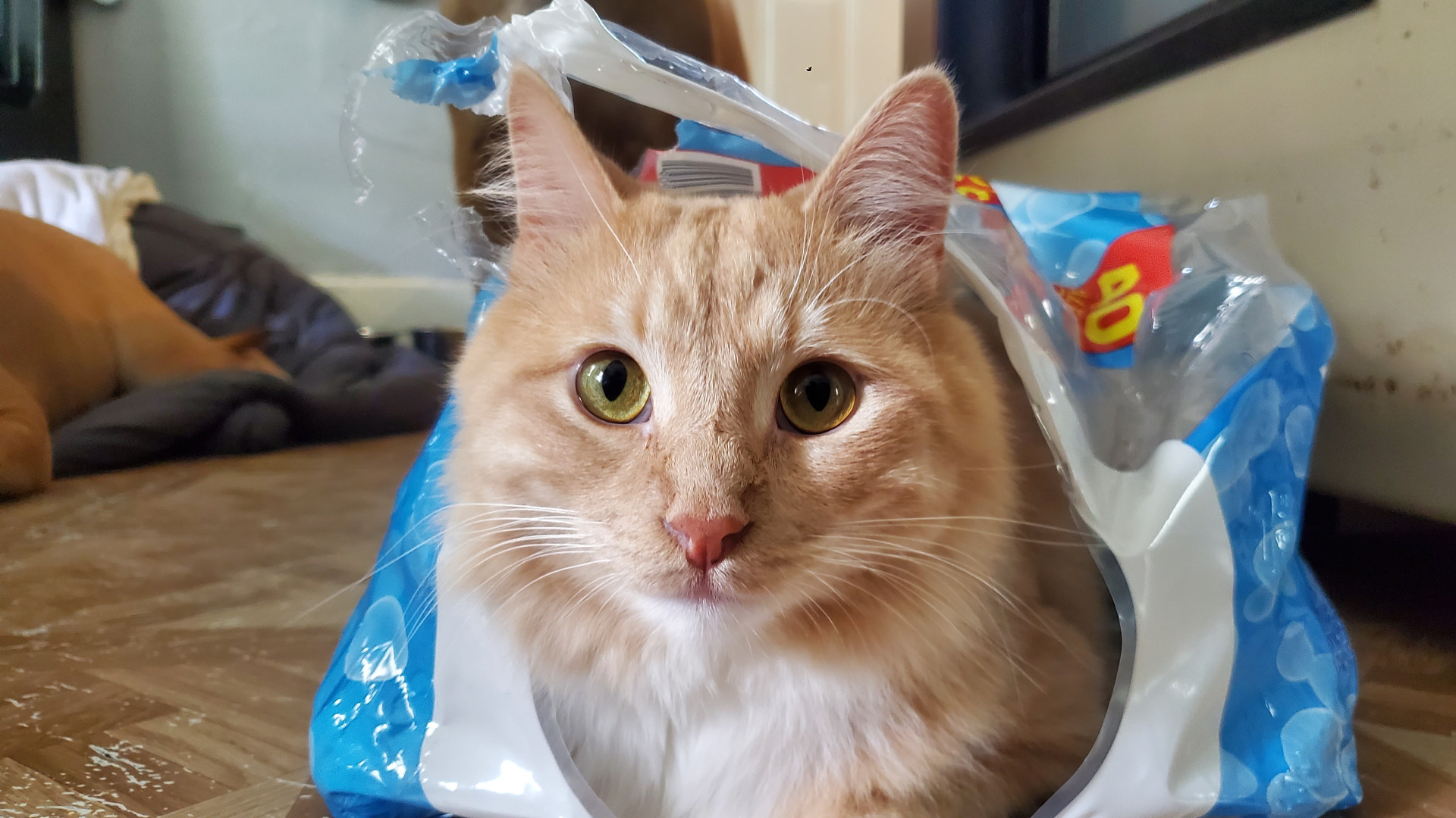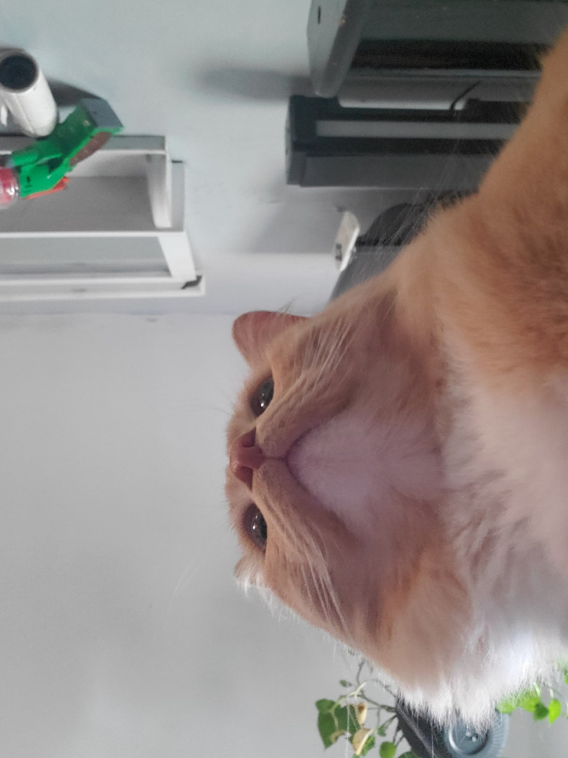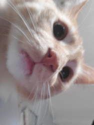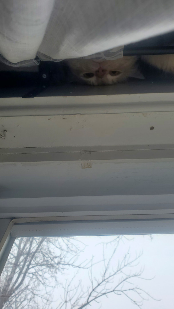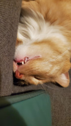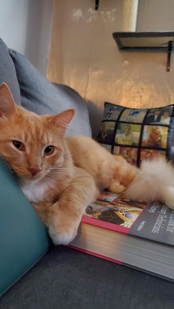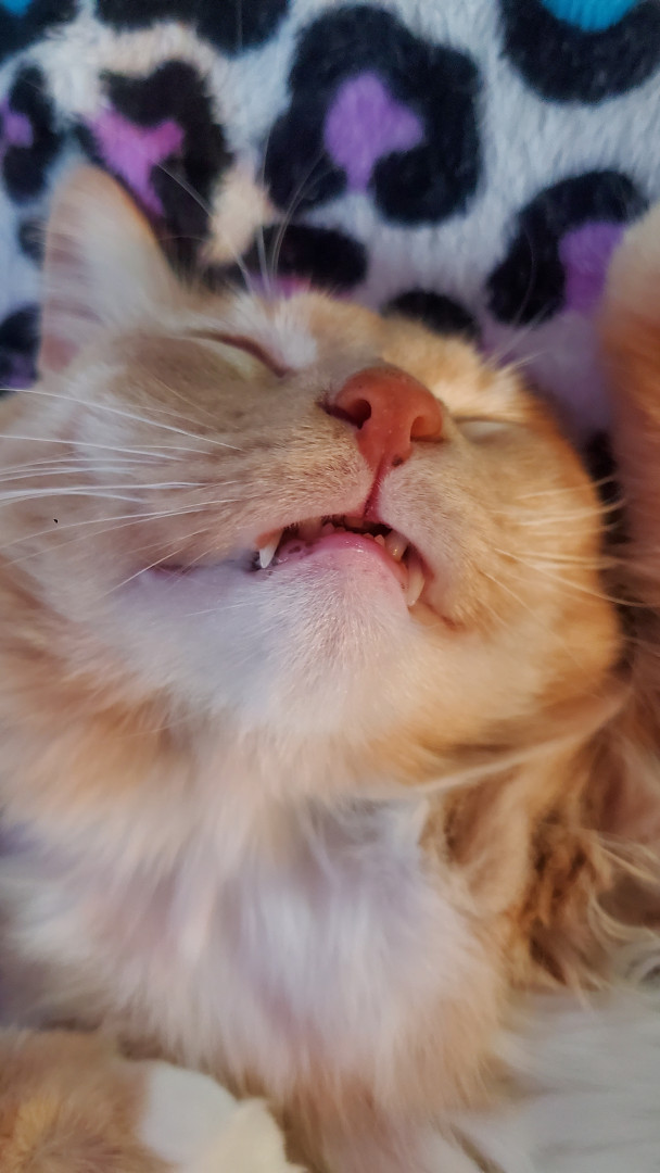He is a trouble maker, he opens cabinets, sits in weird places and will steal your food. He sometimes sleeps with his eyes or mouth open.