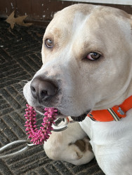 Toys? Anything pretty much! Rings I know he loves to run and catch . But any toy will do for my Frankie!