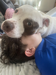Franklin loves everybody! It’s just kisses everybody all over and gives little nibble bites to show. He loves them not to hurt them. He just like is so friendly and caring and loving all the time.! he is very loyal never leaves our side even even need to put a collar on him when we are outside ! He is so gentle and kind loveing friendliest happiest dog ever. He just loves to meet people.!! and show everybody how much he loves you!❤️