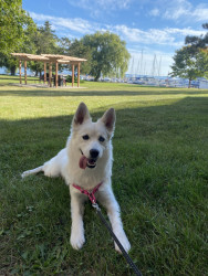 Freya’s go-to toy is anything squeaky or fetchable—though she doesn’t bring them back. Her favourite treats are bone marrow bones— to keep her teeths nice and white and she loves sweet potatoes and green peppers!