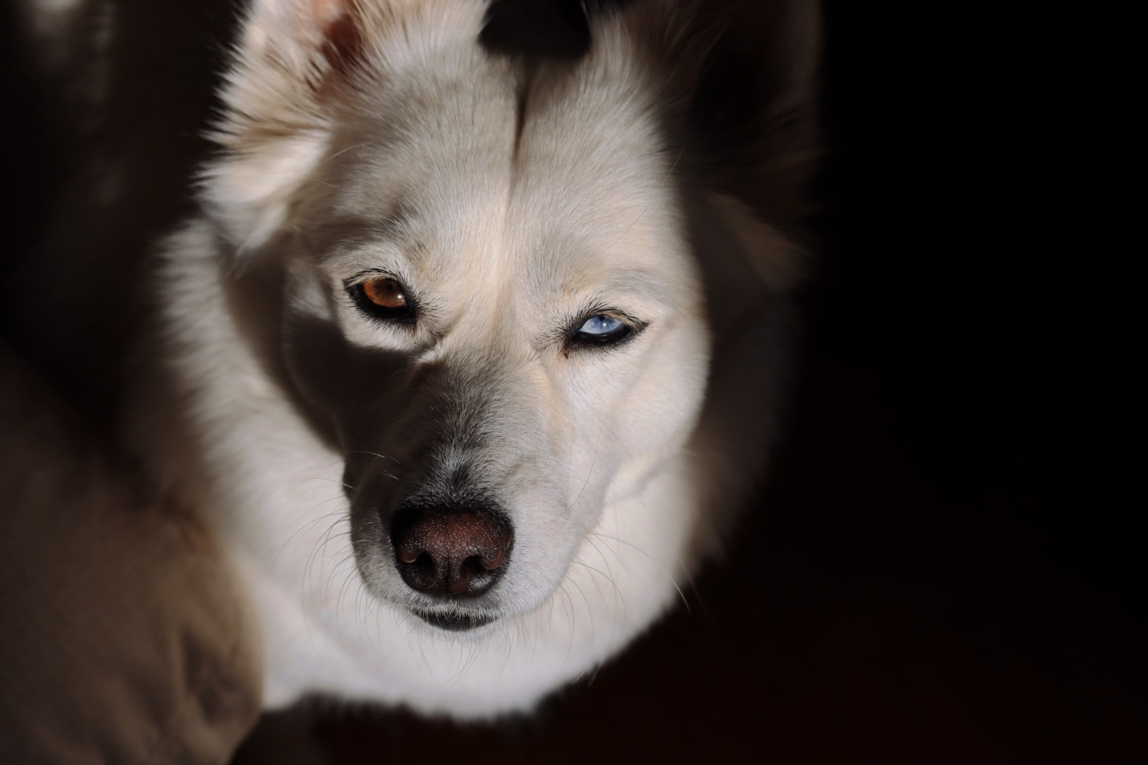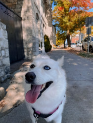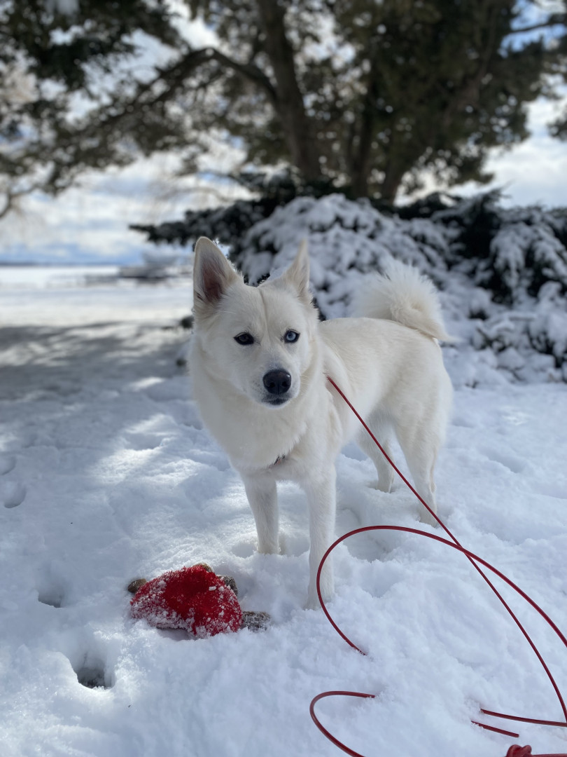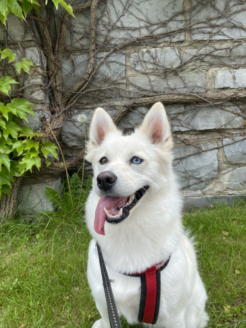 Freya is a fluffy, striking Pomsky with mismatched eyes—one warm brown and the other icy blue. She enjoys curling up like an arctic fox.