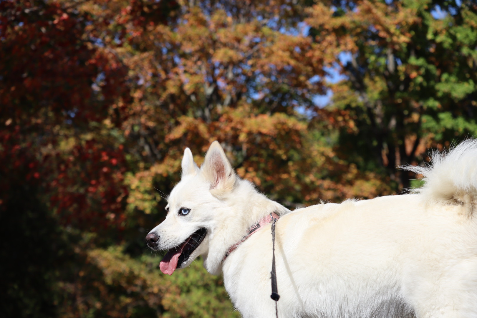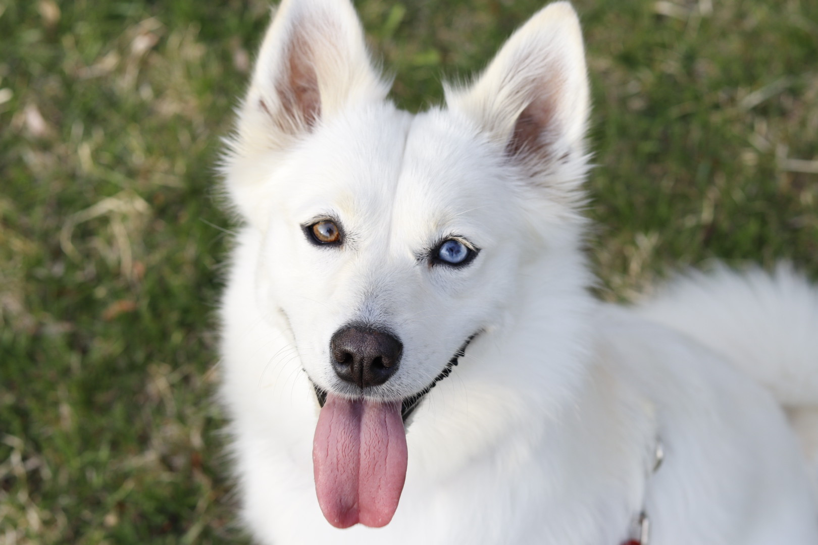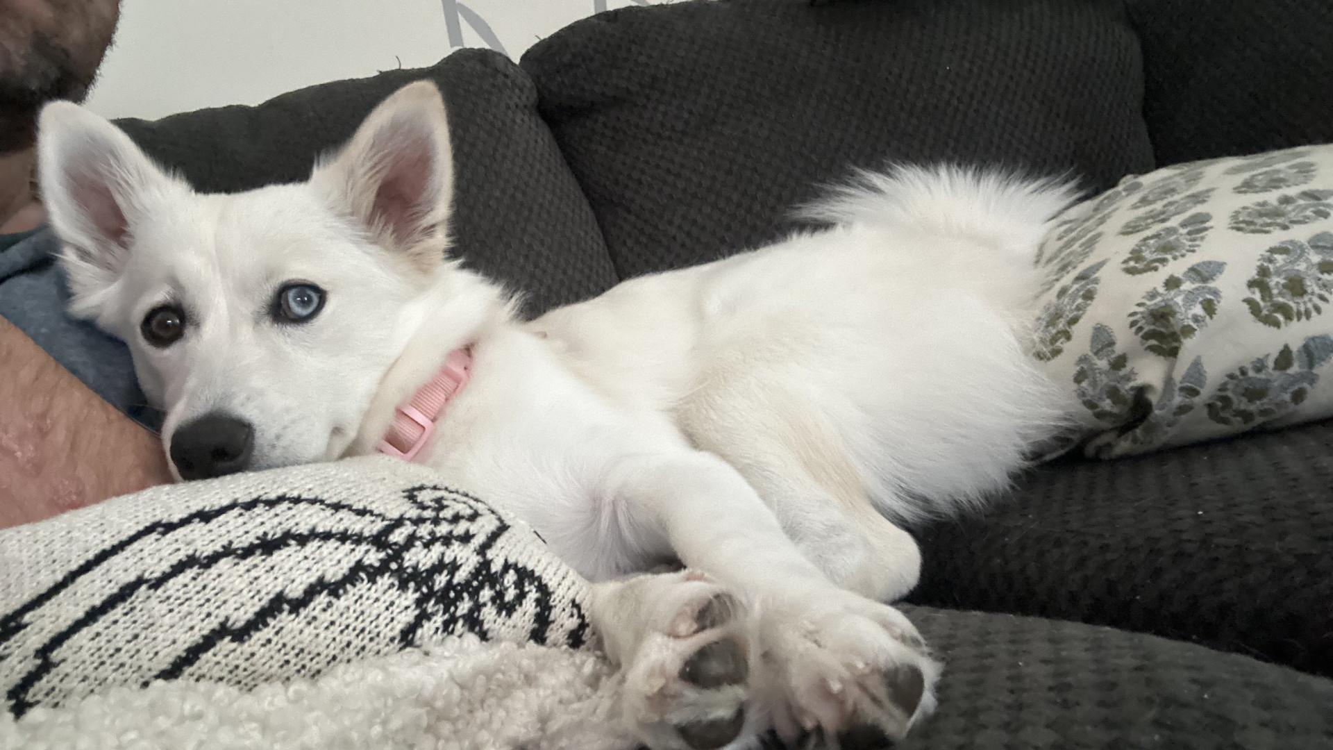 Freya is a fluffy, striking Pomsky with mismatched eyes—one warm brown and the other icy blue. She enjoys curling up like an arctic fox.