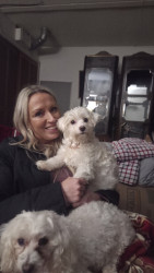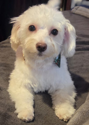 She's so loving and adorable, but what we love about her is that she rarely barks and she licks/gives kisses with just the tip of her tongue. She loves playing with her dog brother.