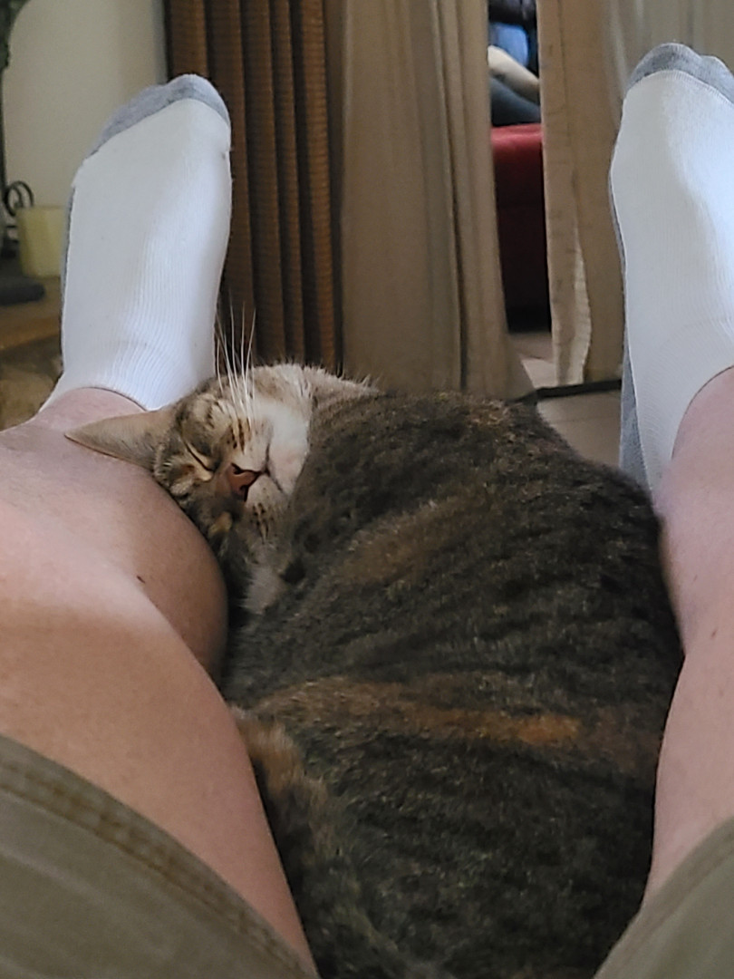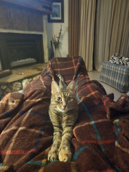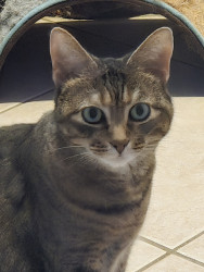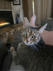 Loves a good petting and loves to roughhouse. She can go from lazy to crazy lickaty split! Frito's an awesome cat!