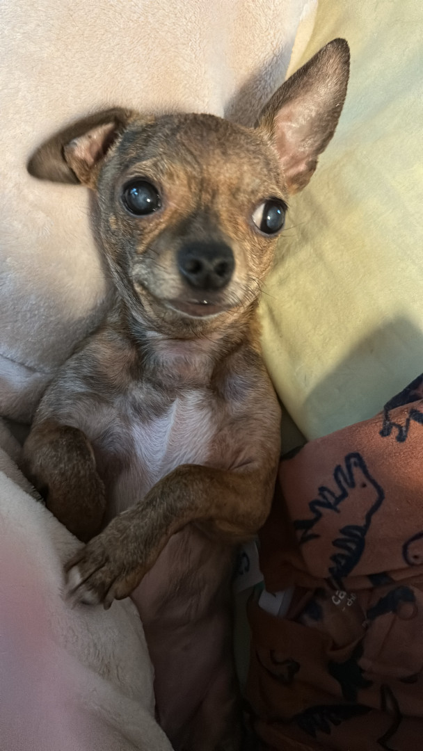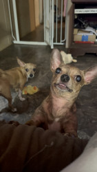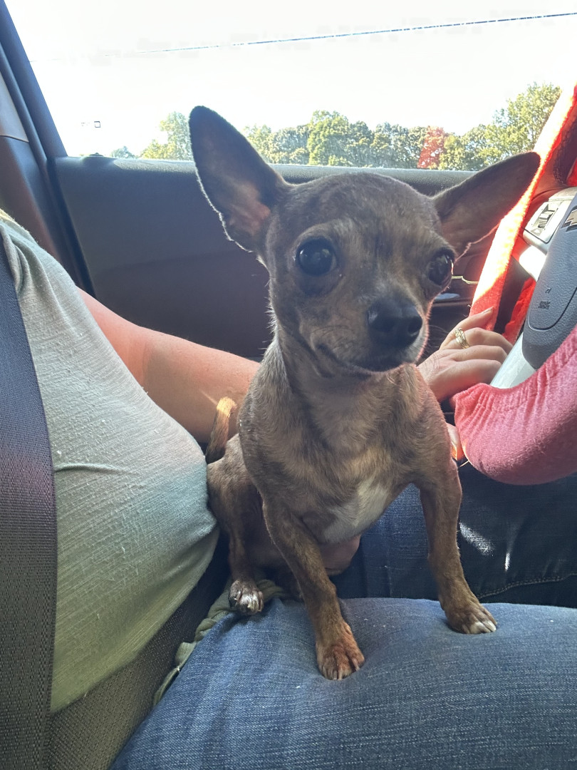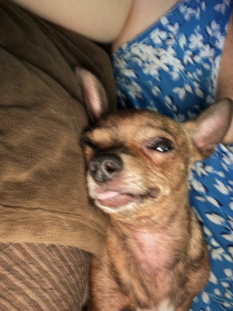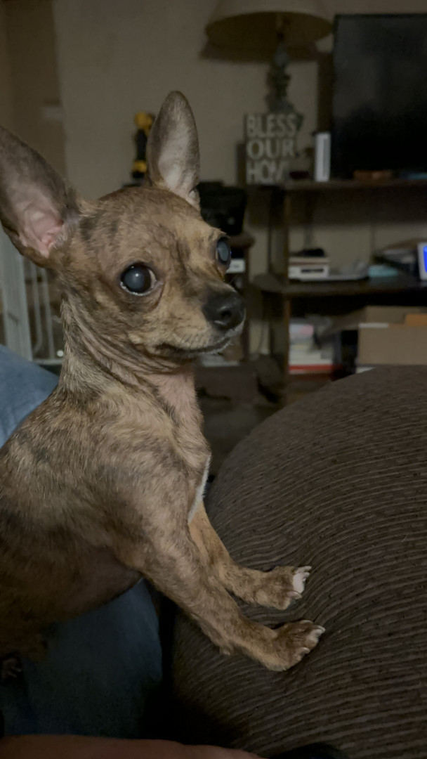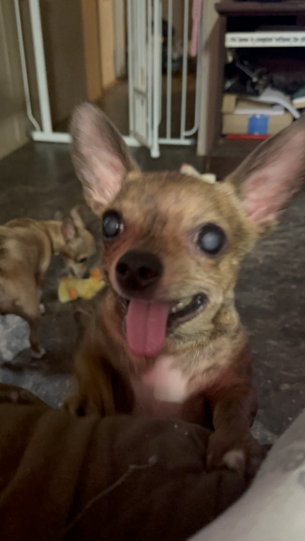Gadget is My blind, almost completely blind, 6 pound, seven year-old Chihuahua. His family couldn’t keep him anymore and we were happy adopt
