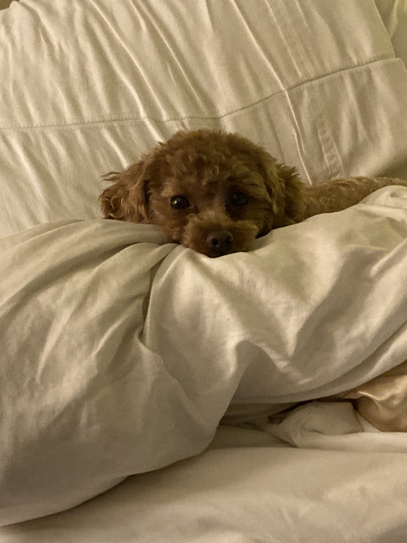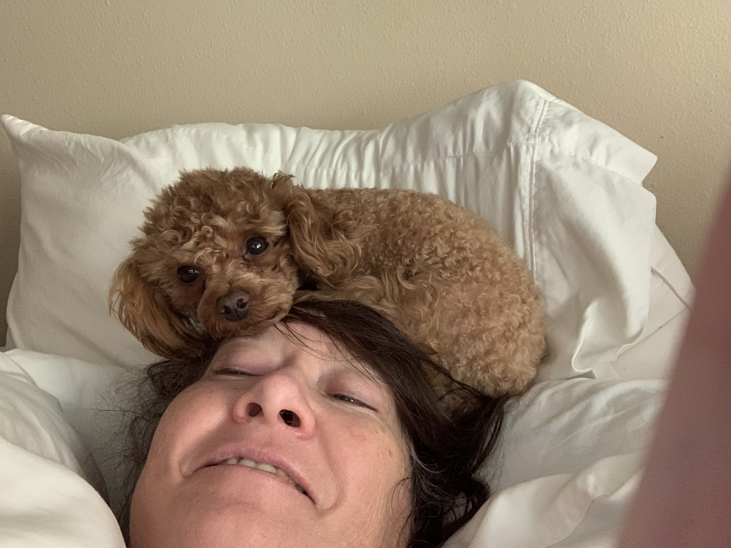 Her most unique quality is her heart. See I have dealt with chronic pain for almost 37 years now. Immediately Gemma started sniffing my entire body at night and she would lay down right next to where I was hurting the most. Then she would rap her whole body around my neck and that’s how we sleep at night. She never leaves my side. I so feel her love our hearts beat as one. We were meant to be together.