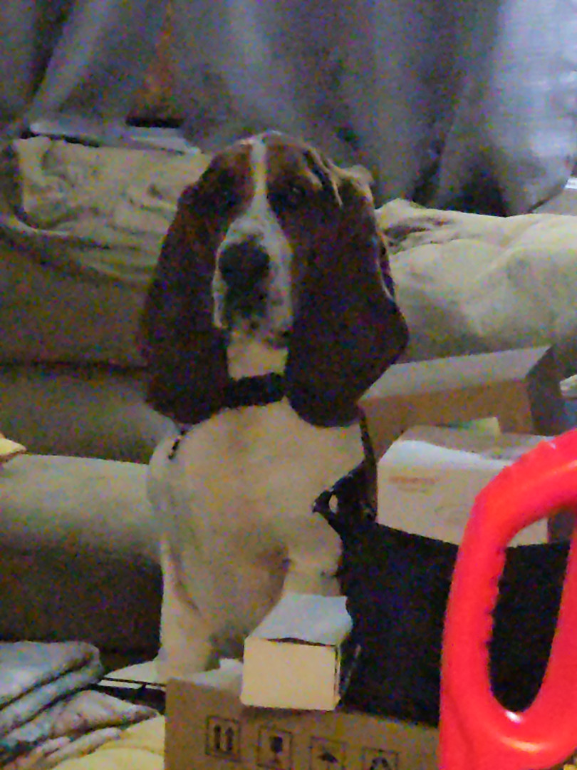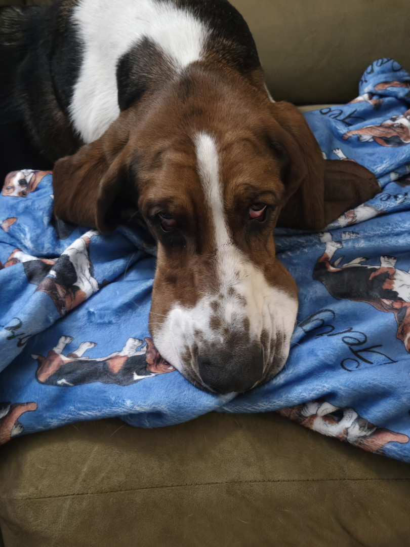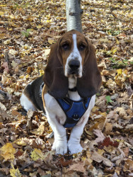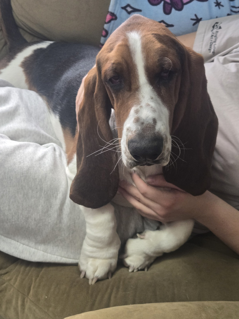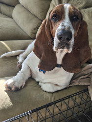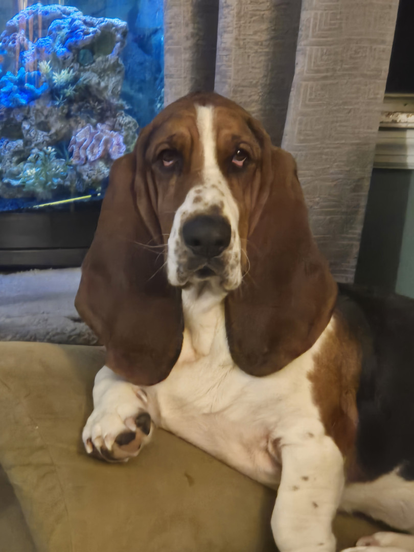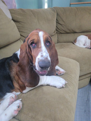 George is a true Basset Hound. His ears and large wrinkled paws are absolutely Basset. He will plop on the corner of the couch and look like hes posing for a portrait.