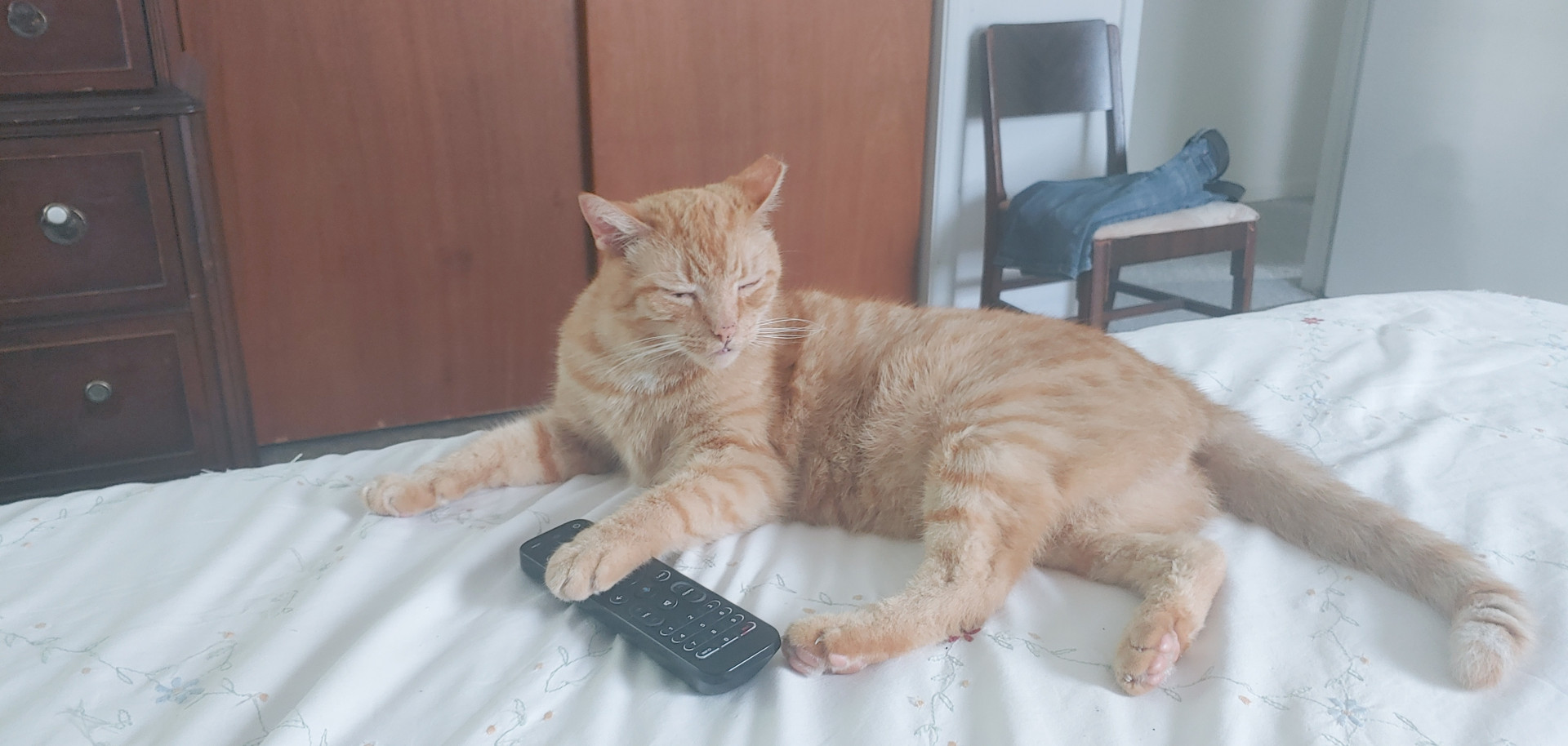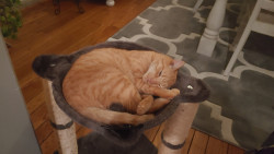 He was a ferrel cat and showed up at our door. Very personal loves company. Follows me around and very protective.