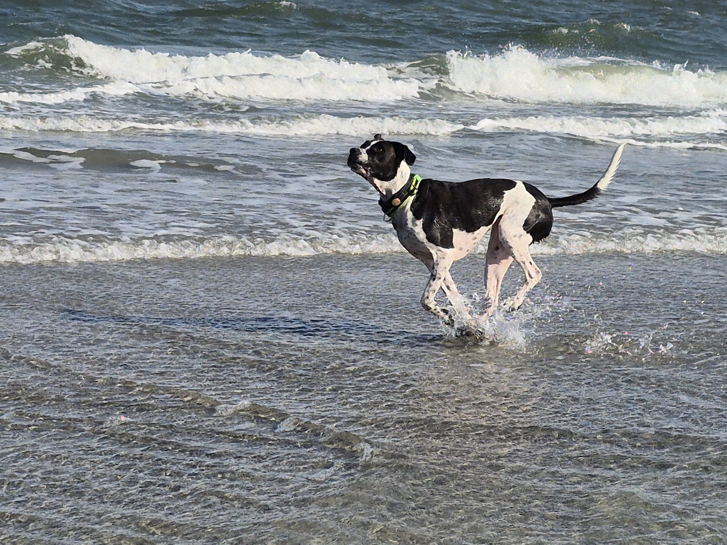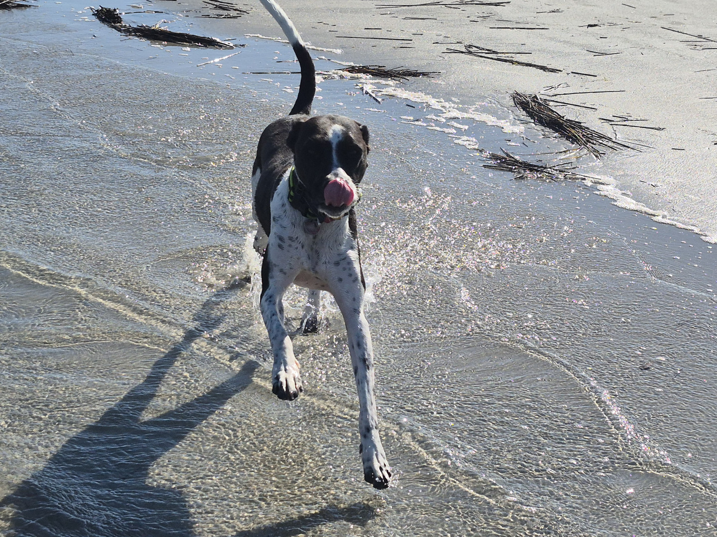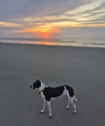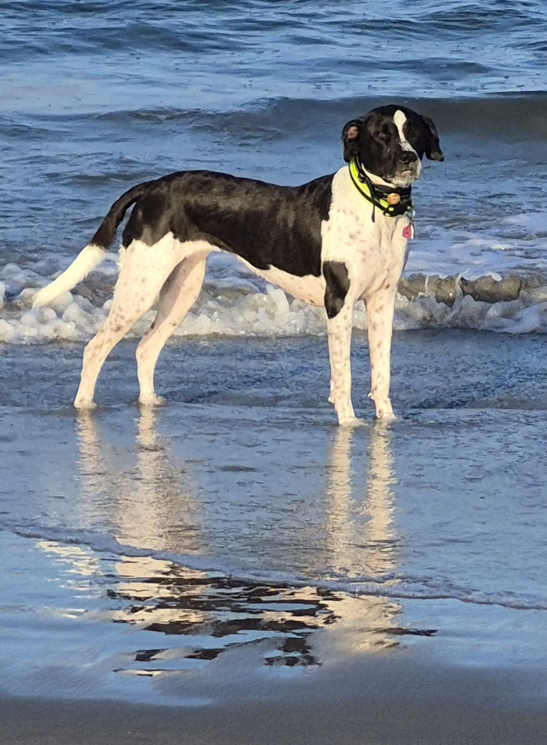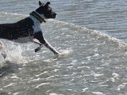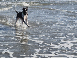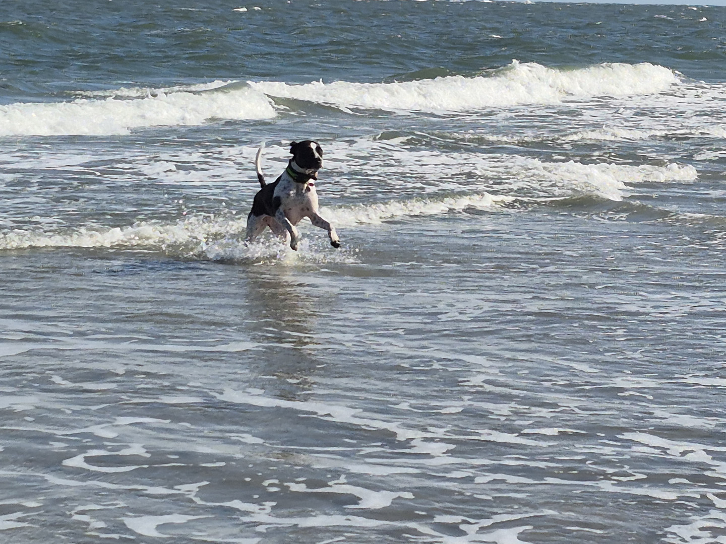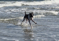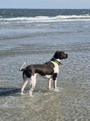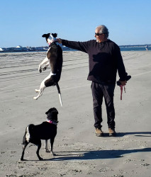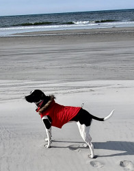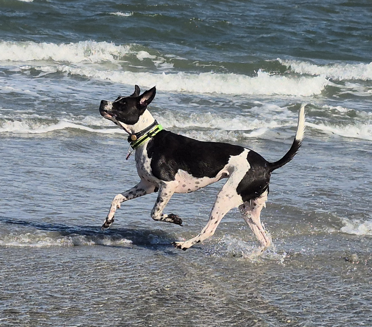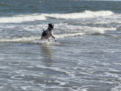 Her amazing ability to jump extremely high. At seven months old form a seated position, Gia jumped to the top of a lifeguard stand with without even trying. She loves bombing around at the beach and in the ocean, chasing all the birds on the beach or in fields. She most of all loved digging in the dirt or climbing to top of piles of dirt when her daddy had major construction going on.