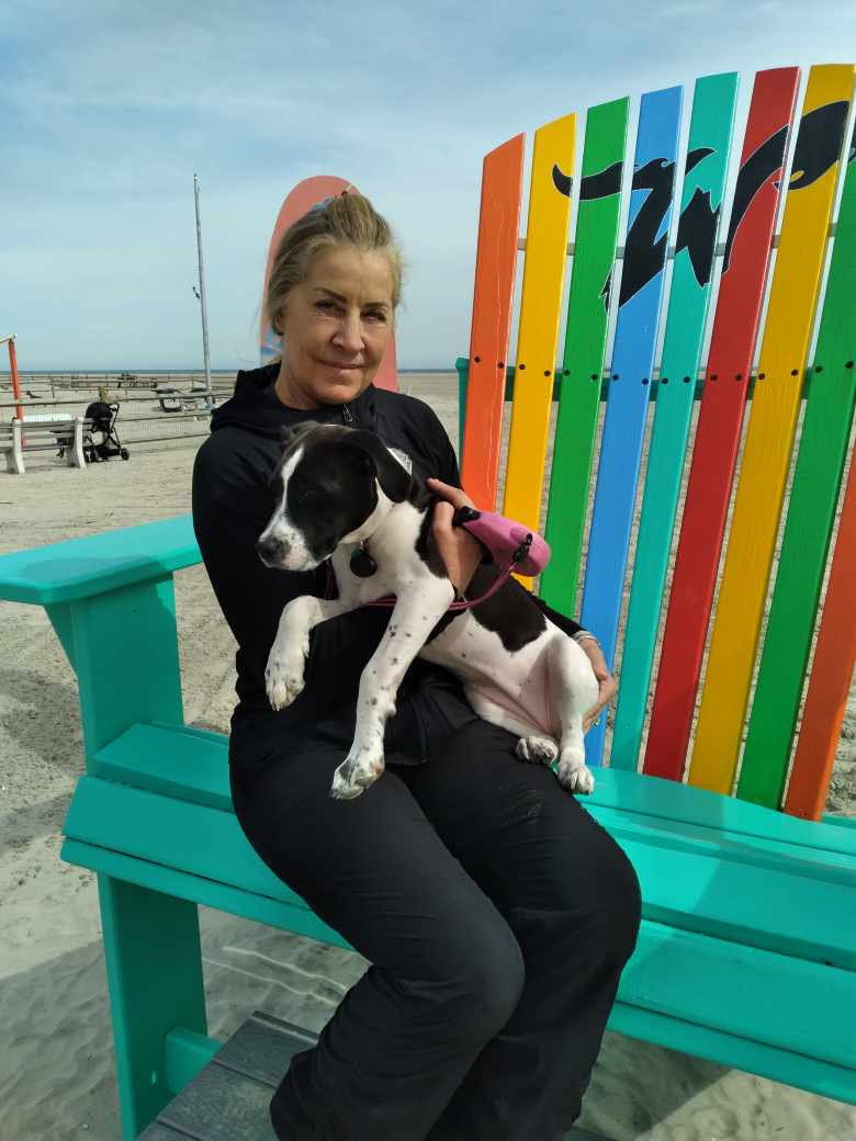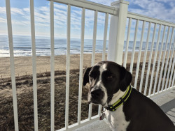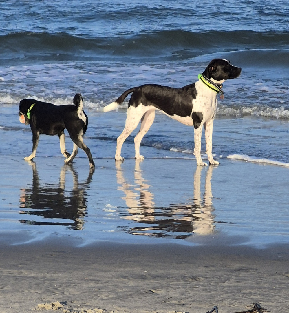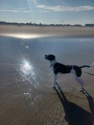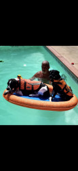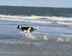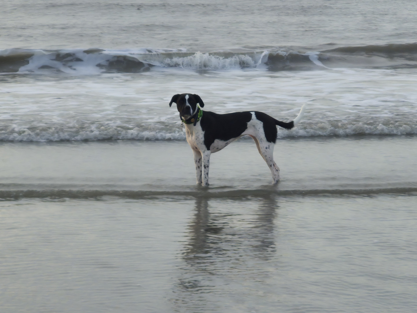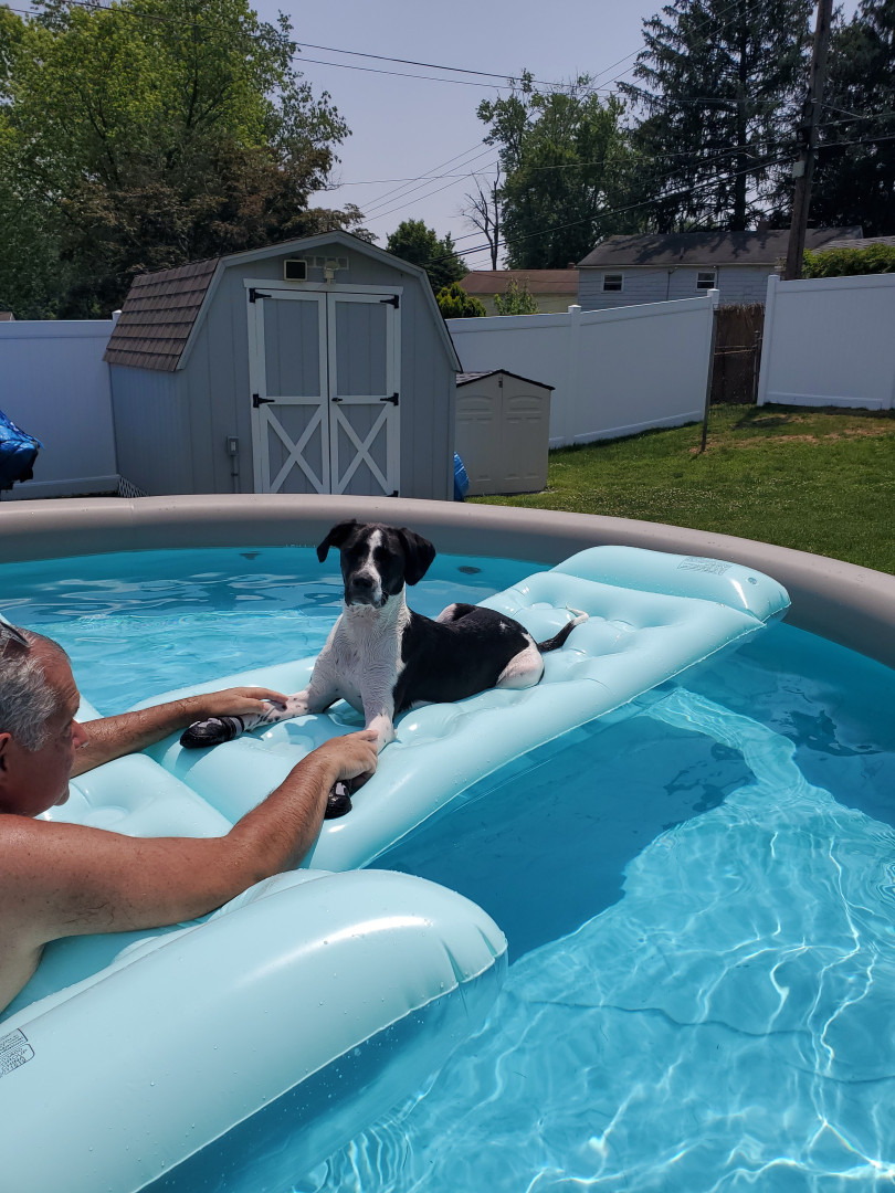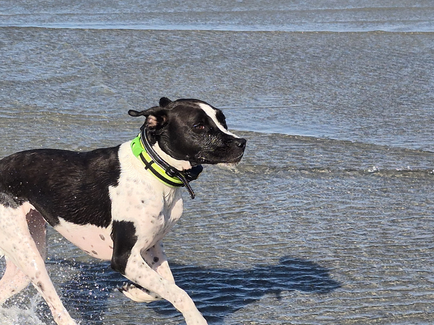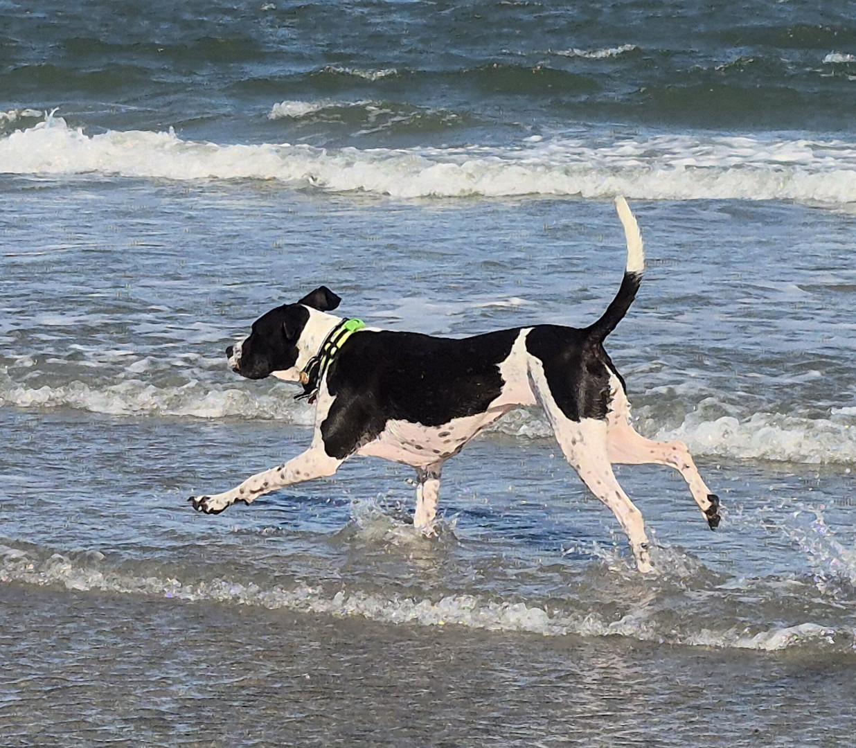 Her amazing ability to jump extremely high. At seven months old form a seated position, Gia jumped to the top of a lifeguard stand with without even trying. She loves bombing around at the beach and in the ocean, chasing all the birds on the beach or in fields. She most of all loved digging in the dirt or climbing to top of piles of dirt when her daddy had major construction going on.