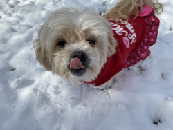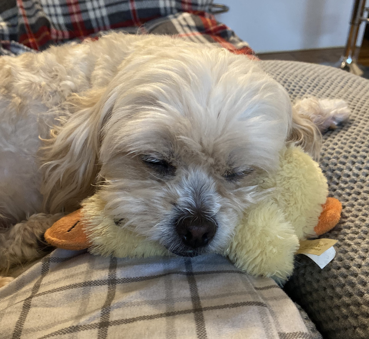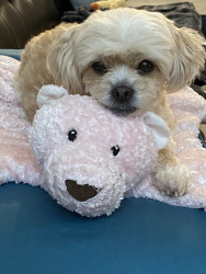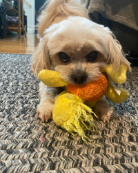 Right now her favorite toy is a purple stuffed hippo. Her go to treats are Wiggles & Wags Peanut Butter Training Bites and Blueberry Anytime Greenies.