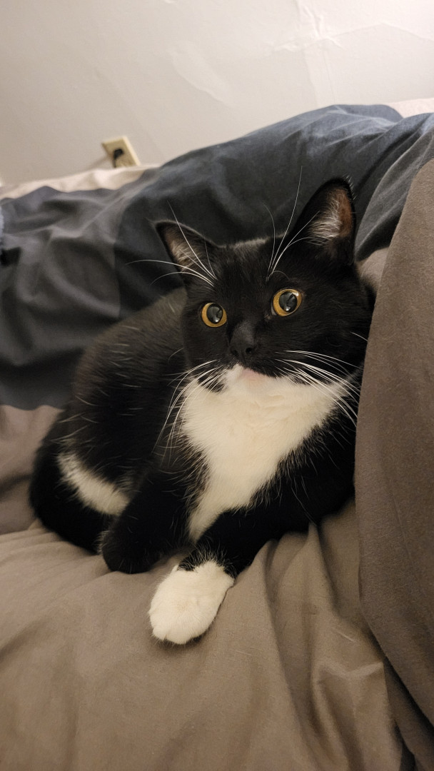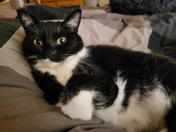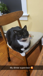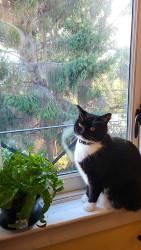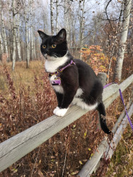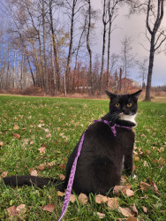 She is a fun loving, chunky tuxedo kitty with a big attitude! She loves going for walks and watching the birds at the feeder.
