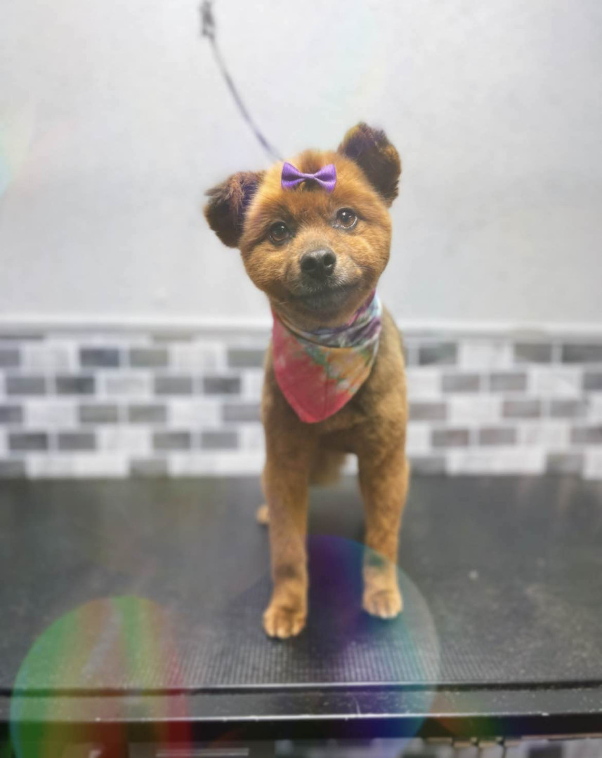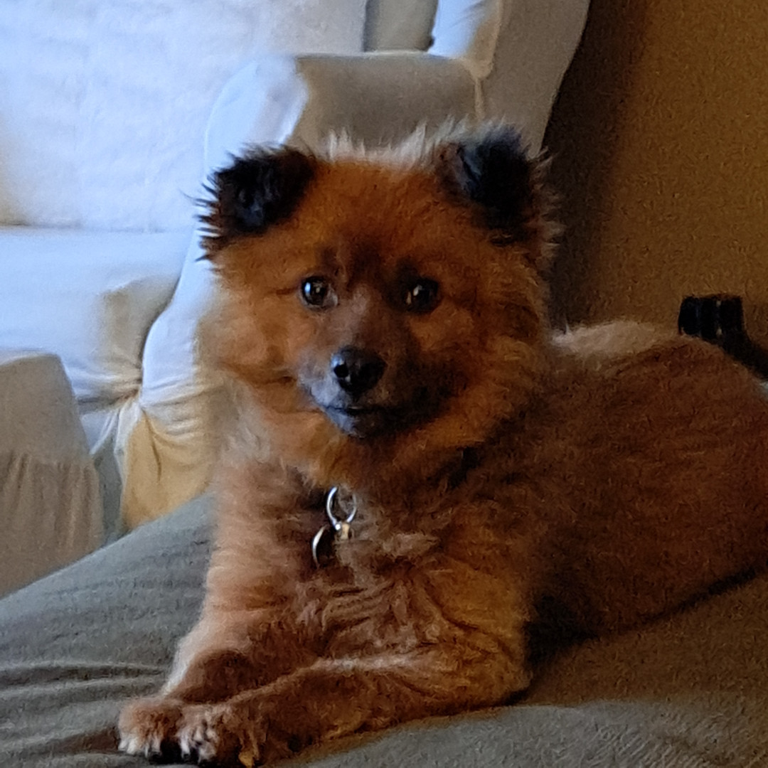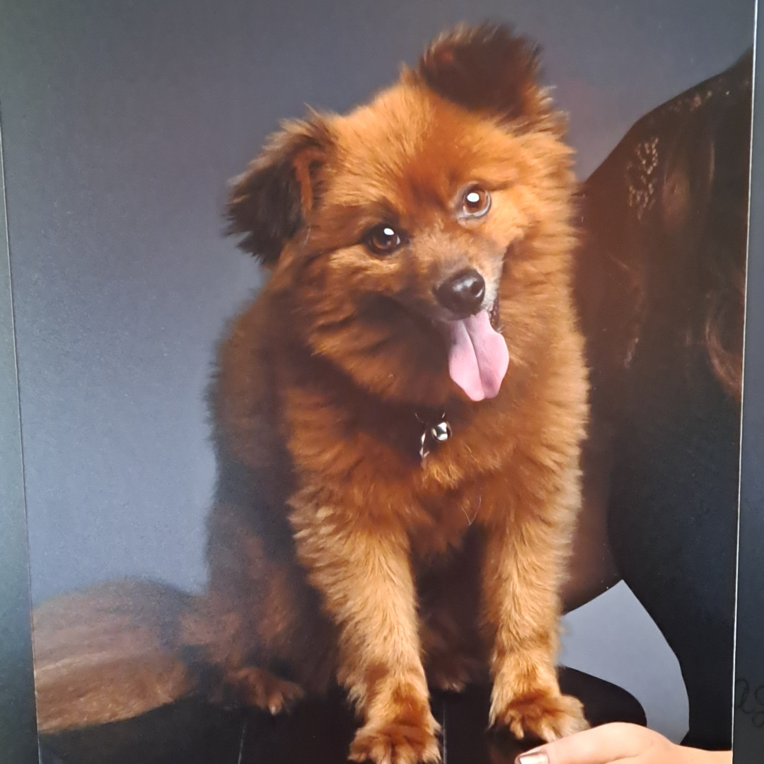 A pomeranian mix that was found on a gravel road at 2 wks old. Eight yrs. later and she's a spoiled, sassy lady!