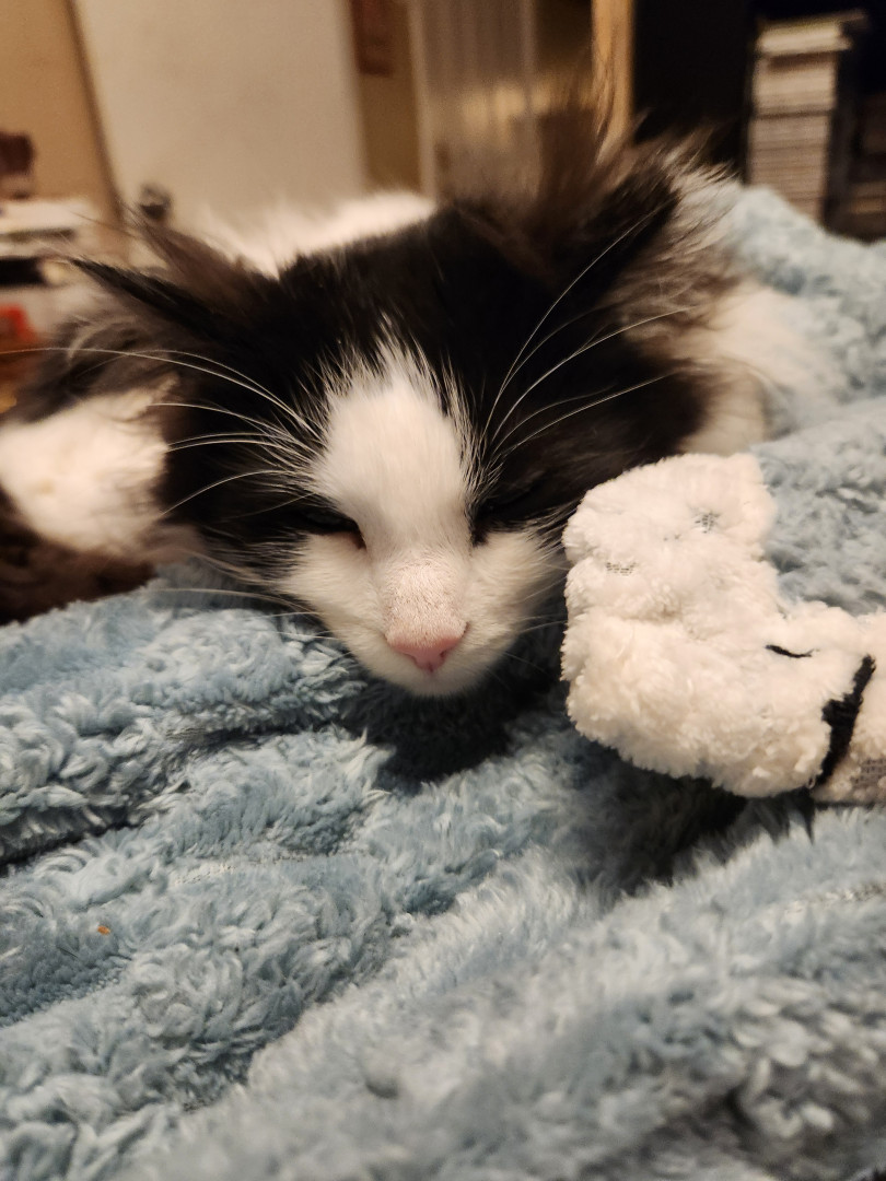 Gizmo is a silly, cuddly cat who still wants to be a kitten! He loves to play, his favorite game being hide and seek, and is a sleepy kitty.