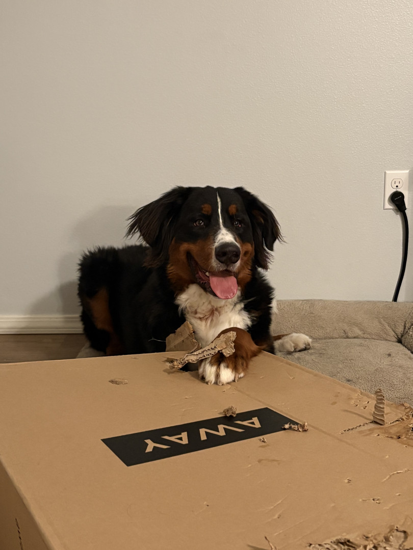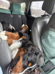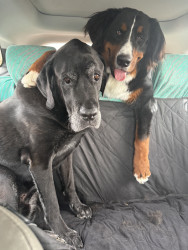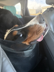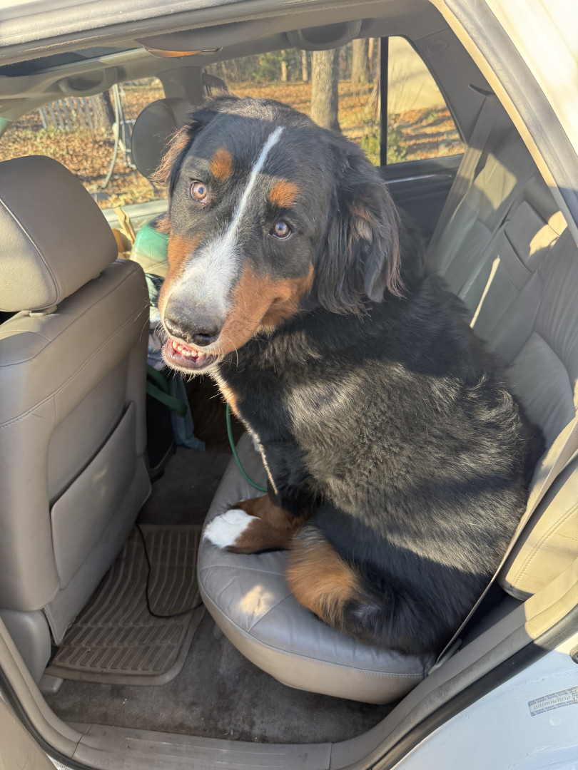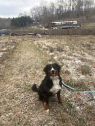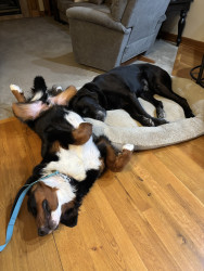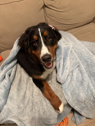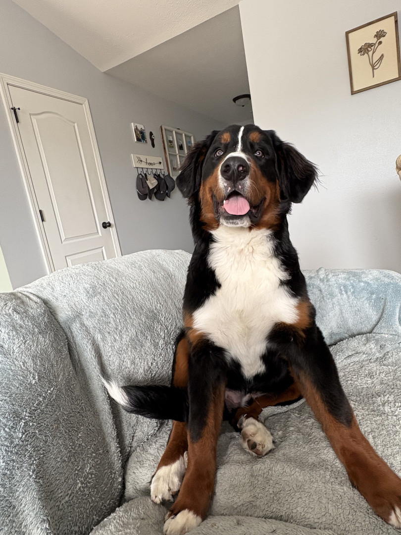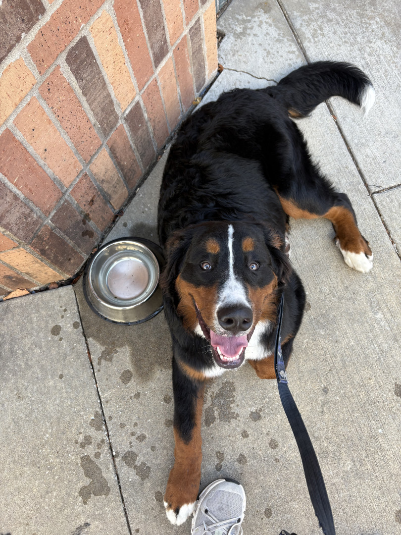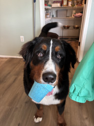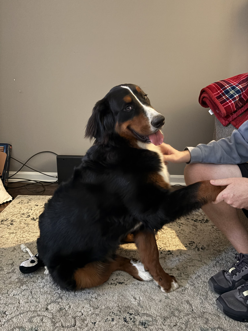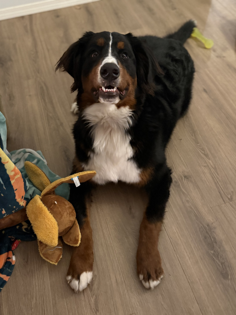 Goose is a 10 mth old 105 lb bernese mountain dog. He loves his humans & older dog. He is like the energizer bunny and keeps us laughing!