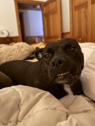While laying next to me, she rests her paws on my lap. She gives me “hugs” by rubbing her head against my chest! And she loves to SMILE!!!
