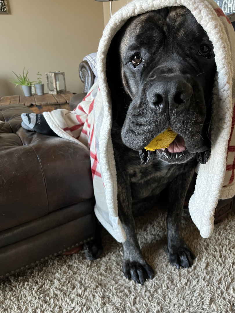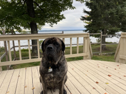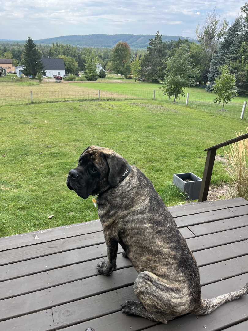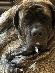 Groot is a 5 year old brindle English Mastiff. He enjoys stuffies, walkies, road trips, and zoomies. He’s the goodest boi!!