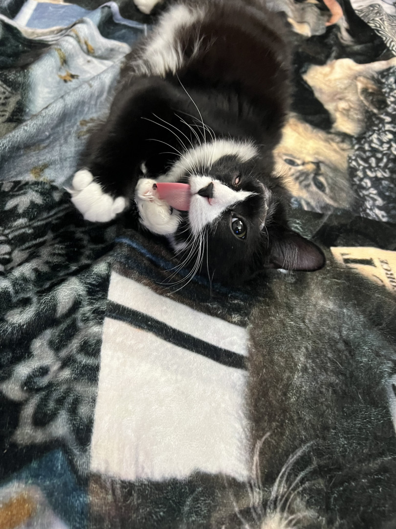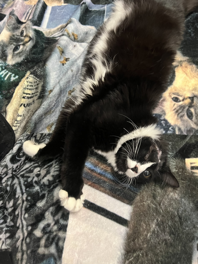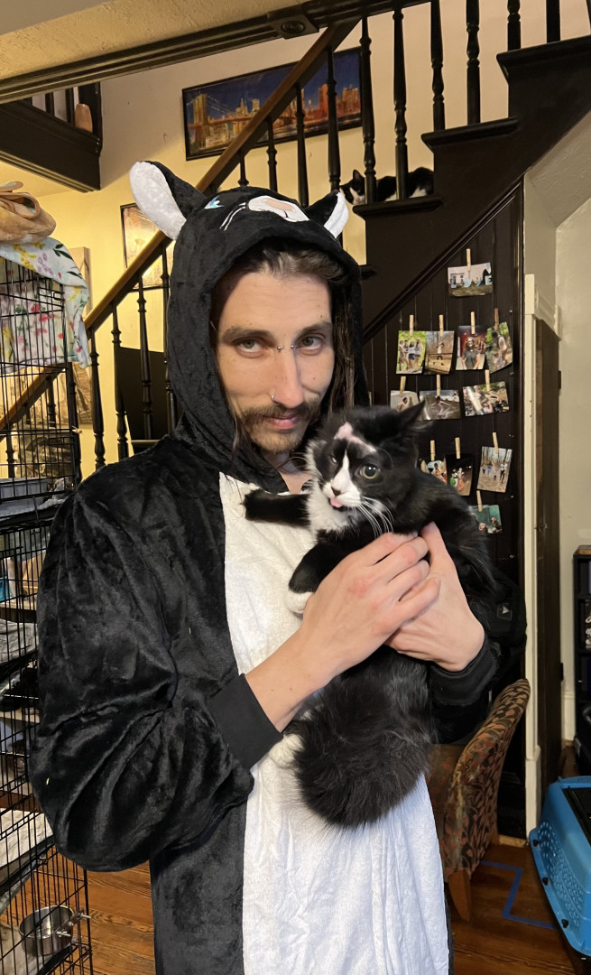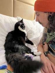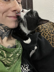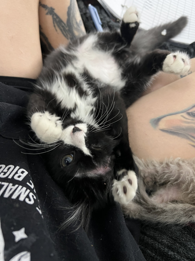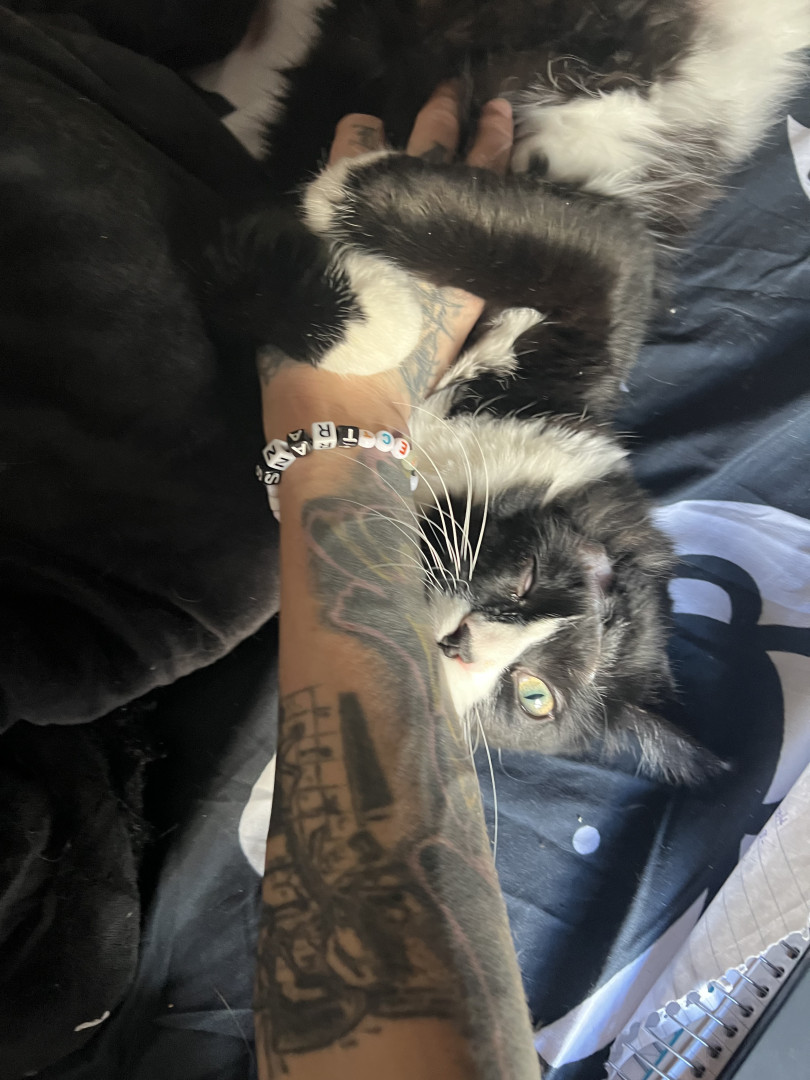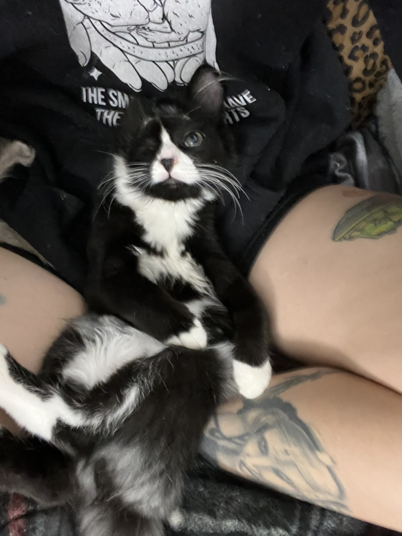 He is so silly and light hearted. He has the most unique playful personality that really makes you watch in admiration wondering what is going on in that beautiful brain. He is a friend to everyone he meets. Grub gives the most intense cuddles and kisses. I love to wake up to him sprawled out in my chest face on face. He truly is my son and doesn’t think anything different. Grub is my familiar, soul cat, best friend. He gets SO excited when I get home and lays with me all day when I’m home.