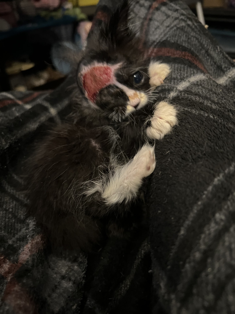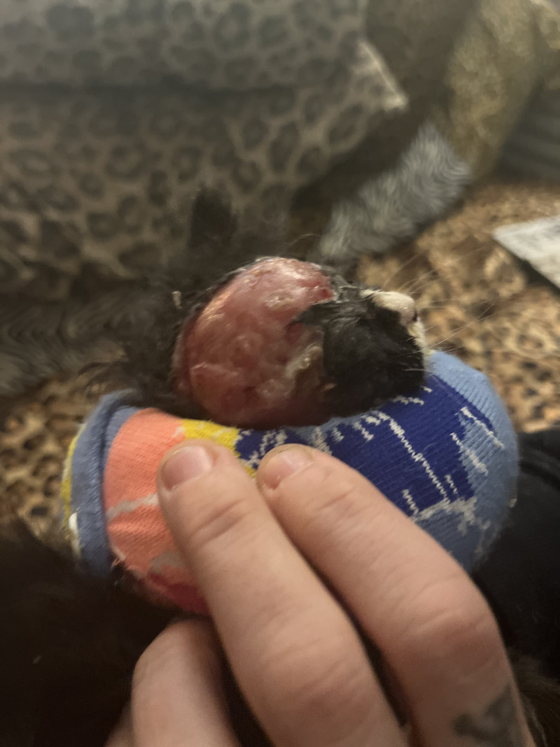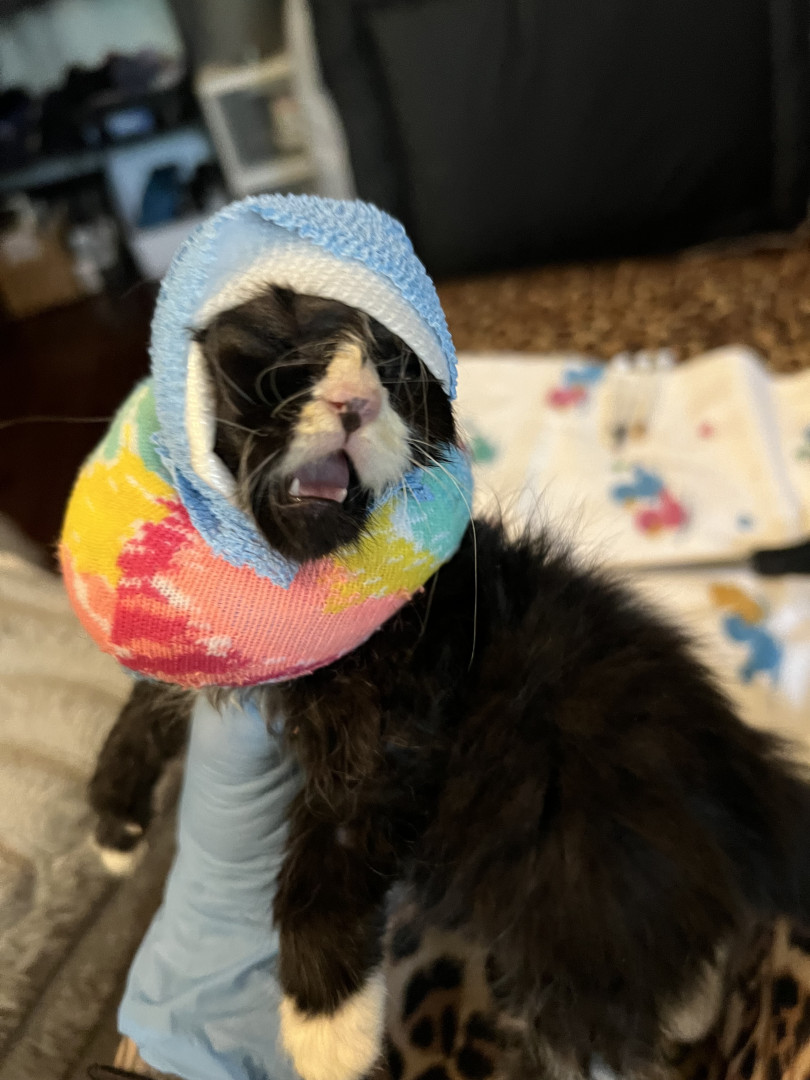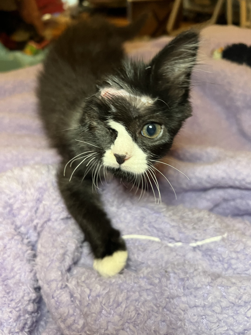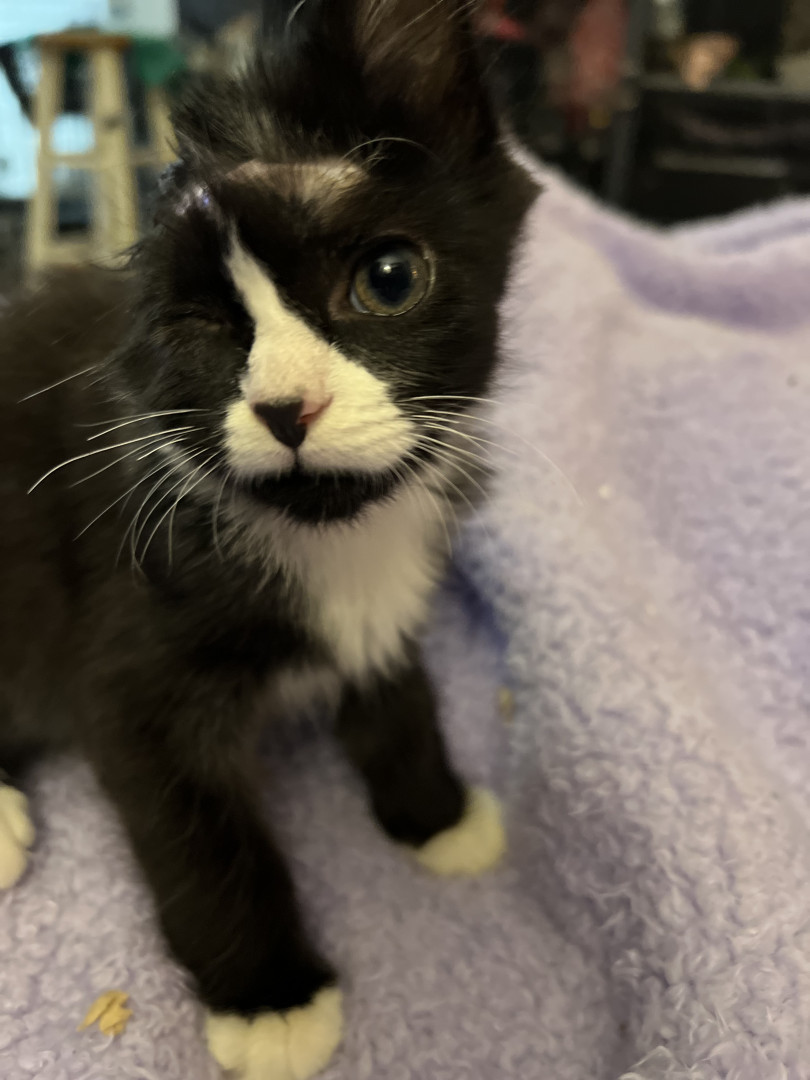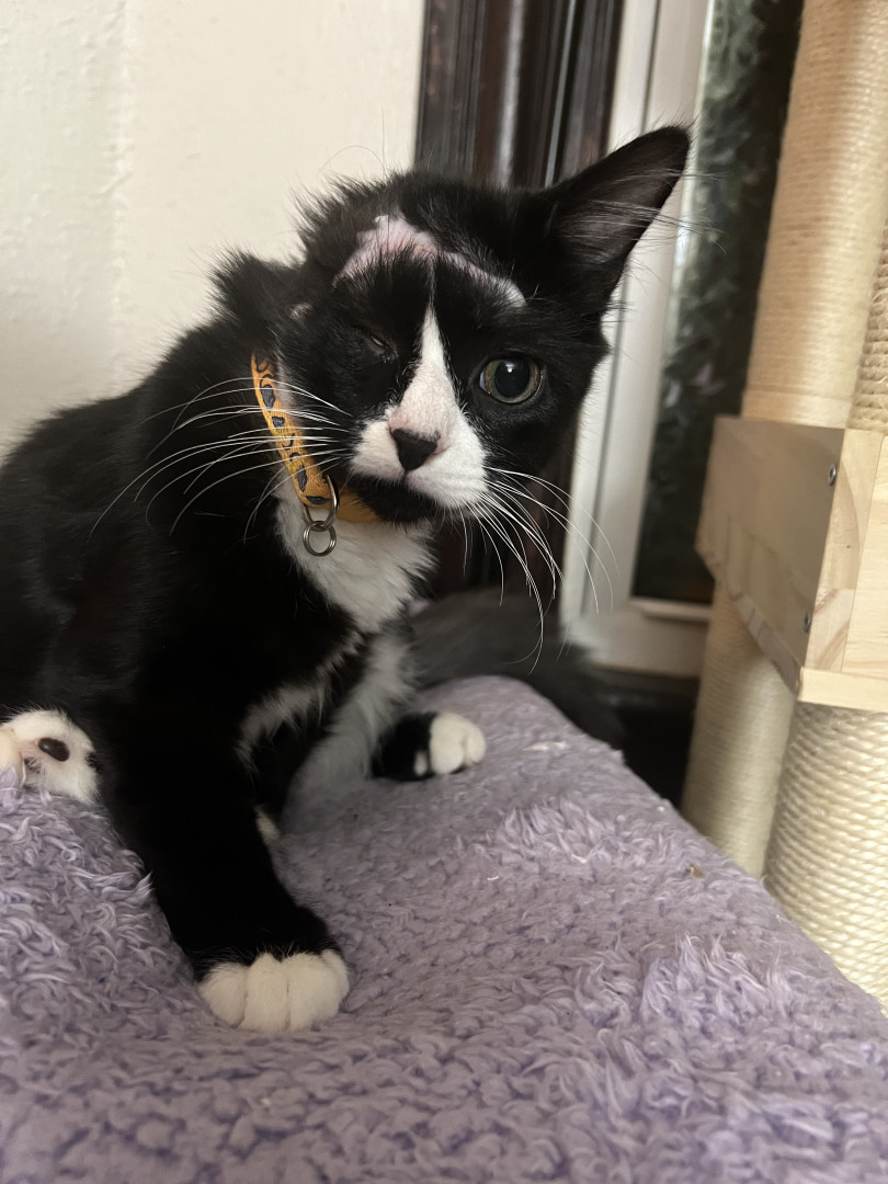 Grub came into the shelter I work at as a tiny kitten that was only 13oz with severe trauma, and skin infection causing permanent damage including loss of his eye and ear, and crushed sinus cavity, and hole in his skull. He stole my heart instantly and has really brought light to my life. Through it all he is still just a charmer and most handsome boy there ever was! He brings comfort to other kittens we foster with medical issues like him! Grub embodies everything this challenge stands for!