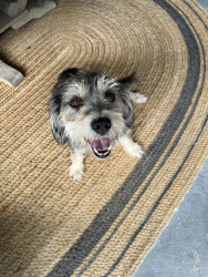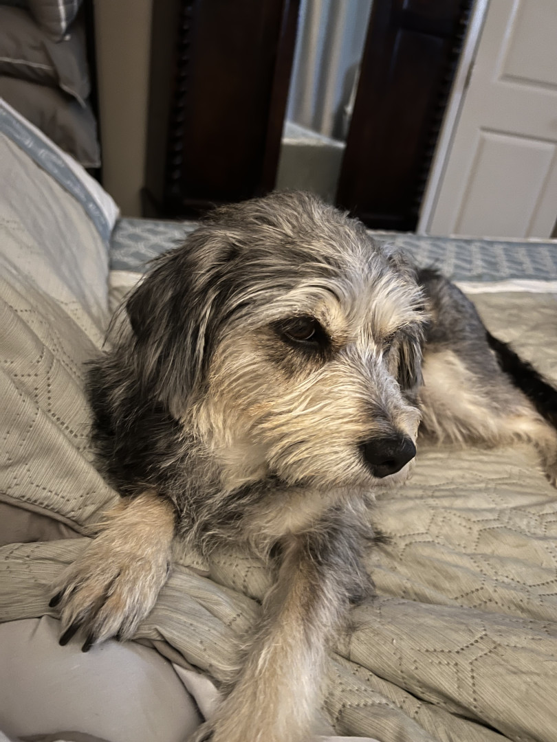 She looks like Benji. She’s a very scruffy little dog who’s not that fond of baths and grooming, although we work hard at it. It takes her a minute to get warmed up, but after that, she is very friendly and loves everybody.