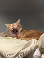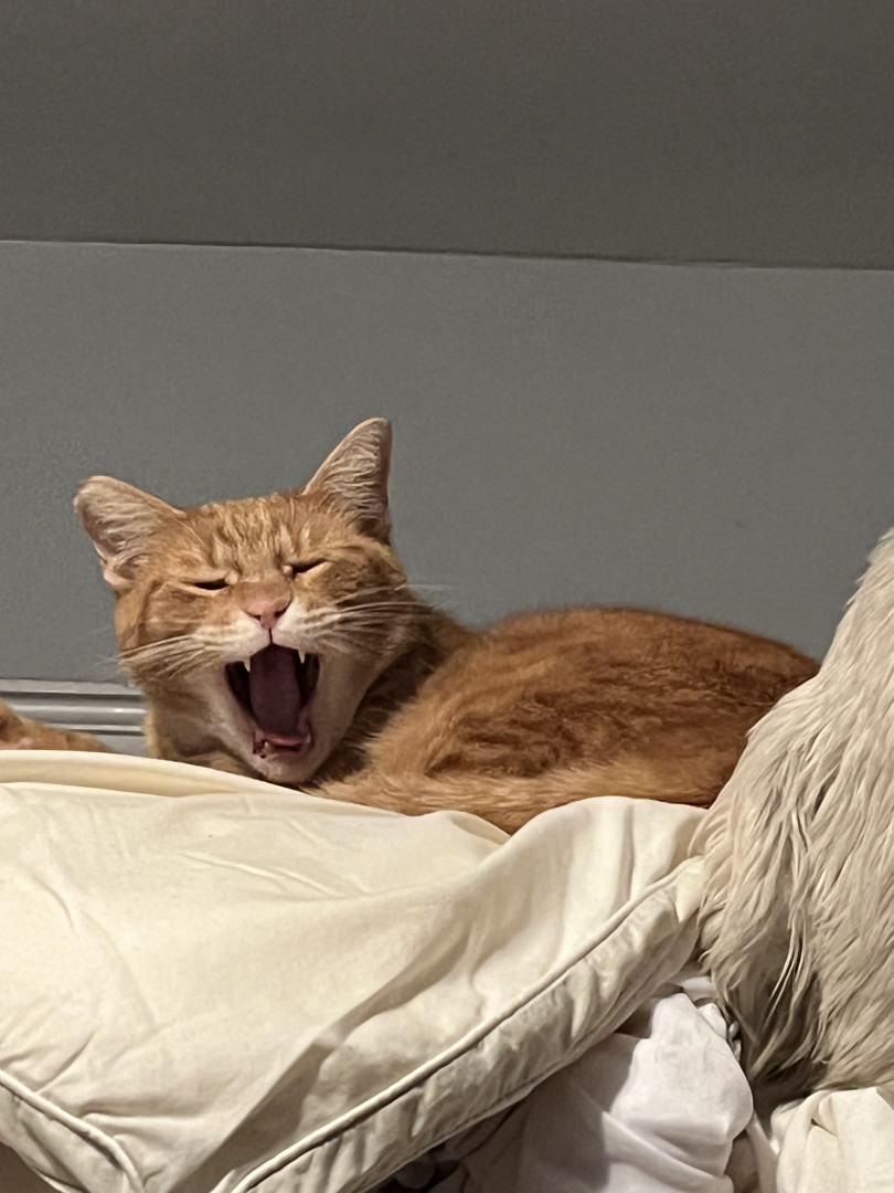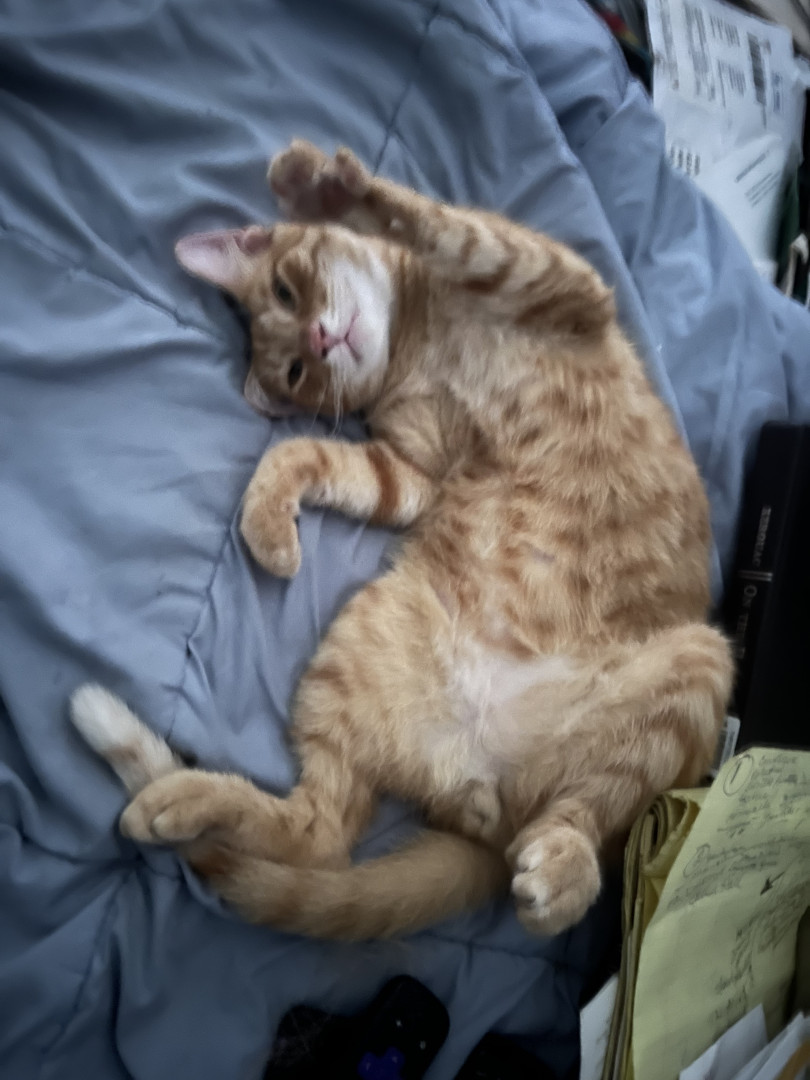 My hand! 😹 or other cats! He’s an Alpha with complete orange tabby vibes. He loves Pounce treats, canned food/tuna and every one else’s food!