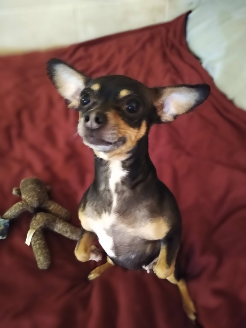 HalfPint has several favorite toys; it's a three way tie between MooCow, Piggy, and her Stinky Sticky! And her favorite treat is a piece of murky; dehydrated beef jerky (the healthy, doggy kind).