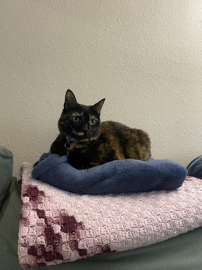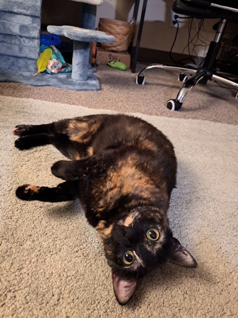 Her fur pattern gives her little eyebrows and a half mustache! She also can do tricks! She can sit, sit pretty, shake, high five, lay down, and jump!