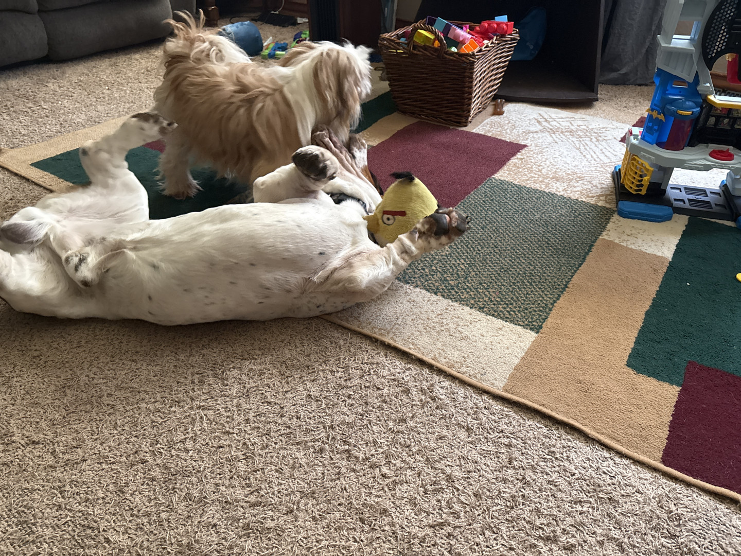 His favorite toy is a rope and he likes to play tug a war with his sister!