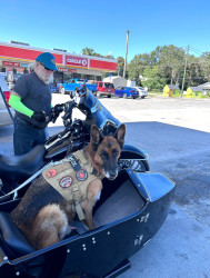He walks me slowly up & down stairs,,,gentle, not pulling me.His ability to jump high in the air to catch his freebie is pretty unique.He has his OWN sidecar motorcycle,,,,Harley has been to numerous biker events includingDaytona Bike Week,Sturgis,Laconia,etc,So, that makes him unique to everyone that sees him riding