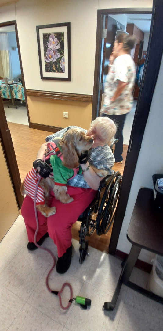 Harley is 2 and 1/2 year old cocker spaniel therapy dog who loves to visit nursing homes in our area she loves to visit her friends