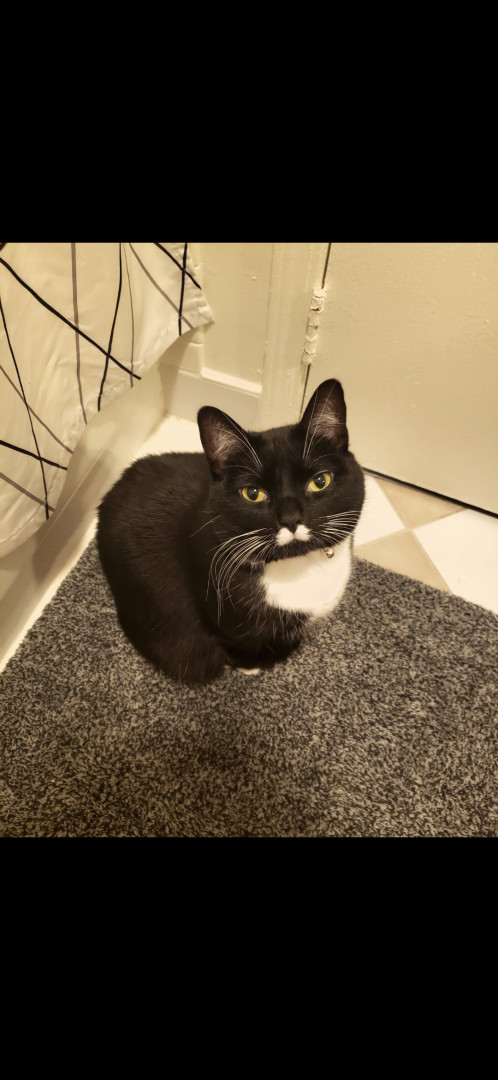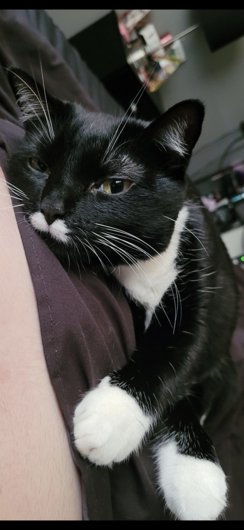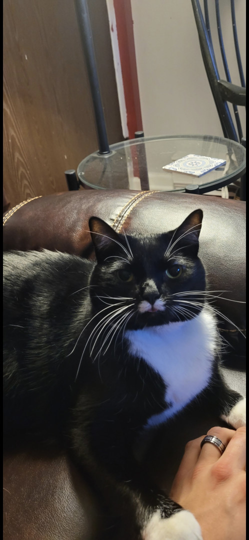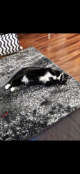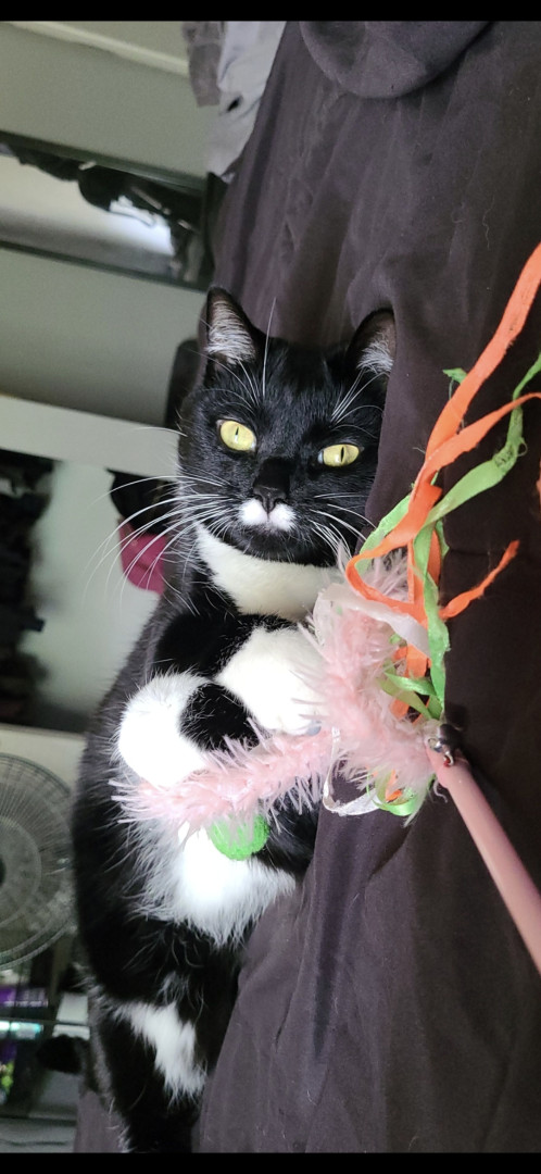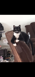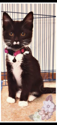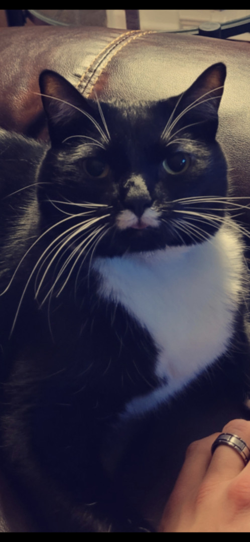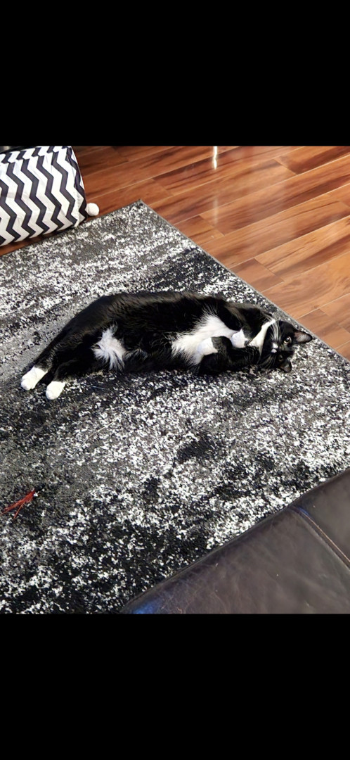This is Harley! She is an 8 year old Tuxedo and is quite the character! Harley grew up with rabbits and loves to eat lettuce.