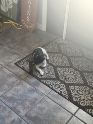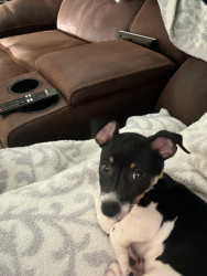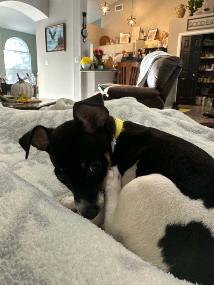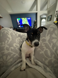 Is a Teddy Roosevelt Rat Terrier. She is small but mighty. Protective of her house and family , likes to sit on your lap and snuggle.